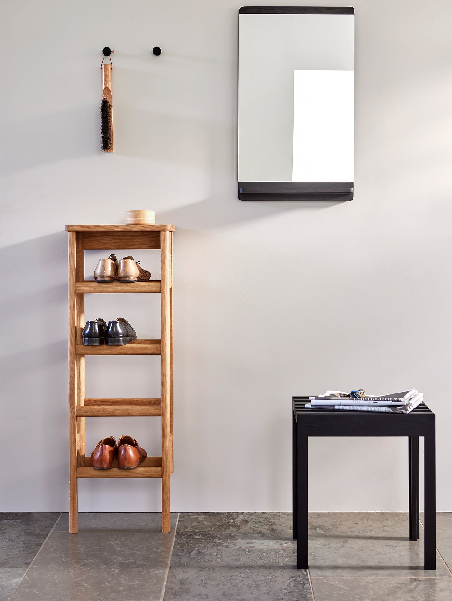 Form and Refine の A ライン シューズ ラック 35 は、都市部の最も小さなアパートでも使用できるように設計されており、コンパクトな廊下をすっきりと整え、毎日の靴や日用品を保管できます。