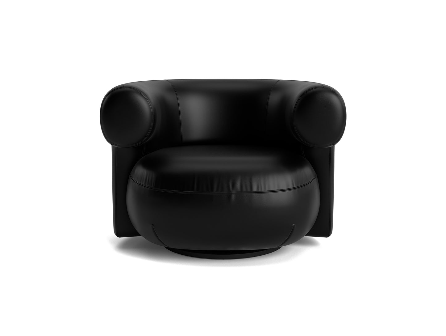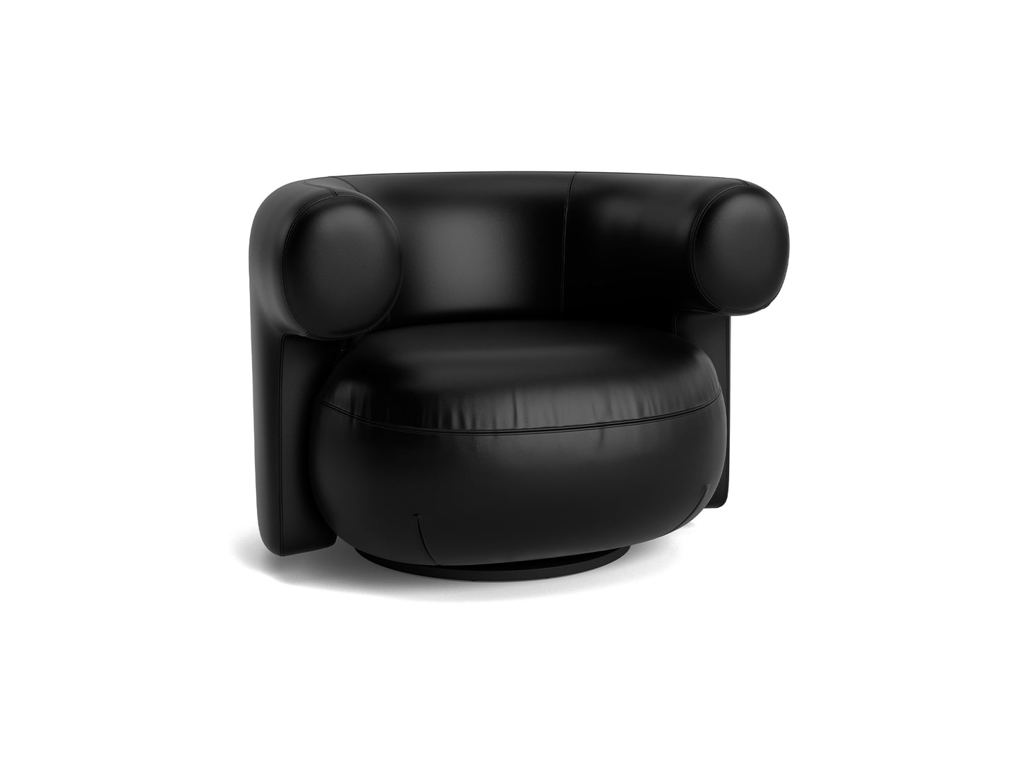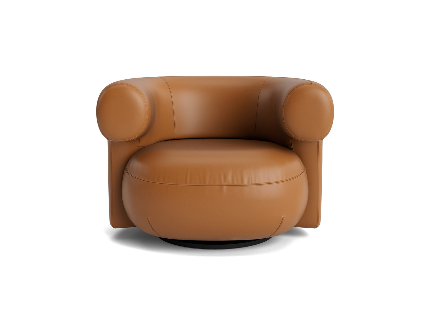 Featuring a round seat and a generously curved backrest that flows naturally into the armrests, this plump design ensures maximum comfort. Its distinctive shape reflects softness, and a swivel function with a return feature provides complete freedom of movement. The swivel base allows smooth rotation, making the chair ideal for both social and relaxed settings.