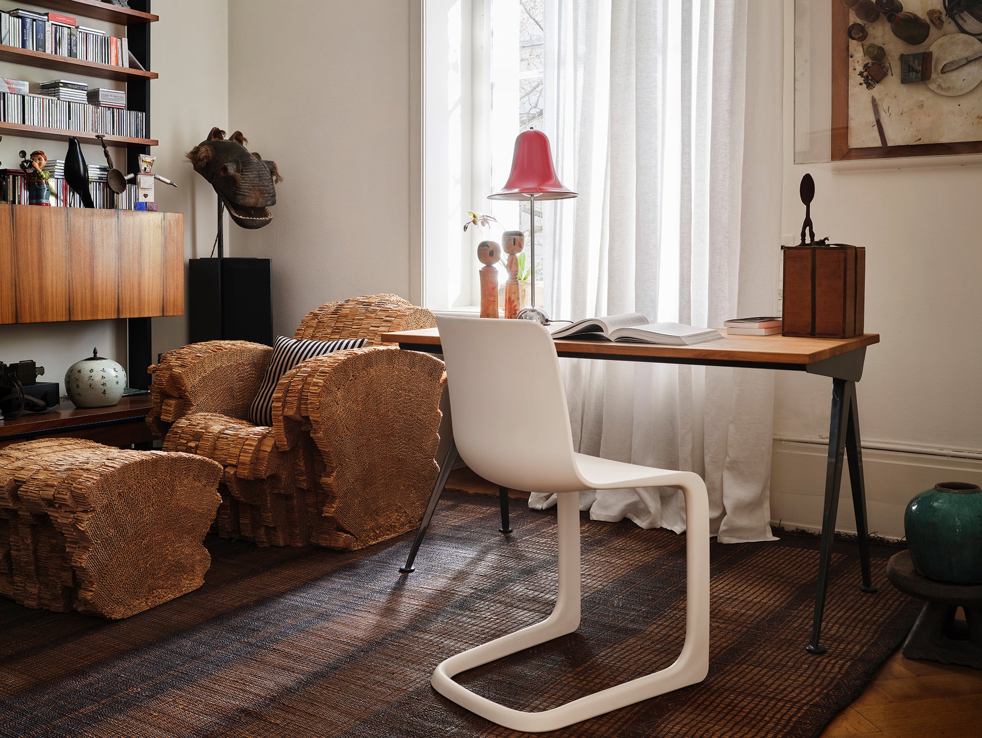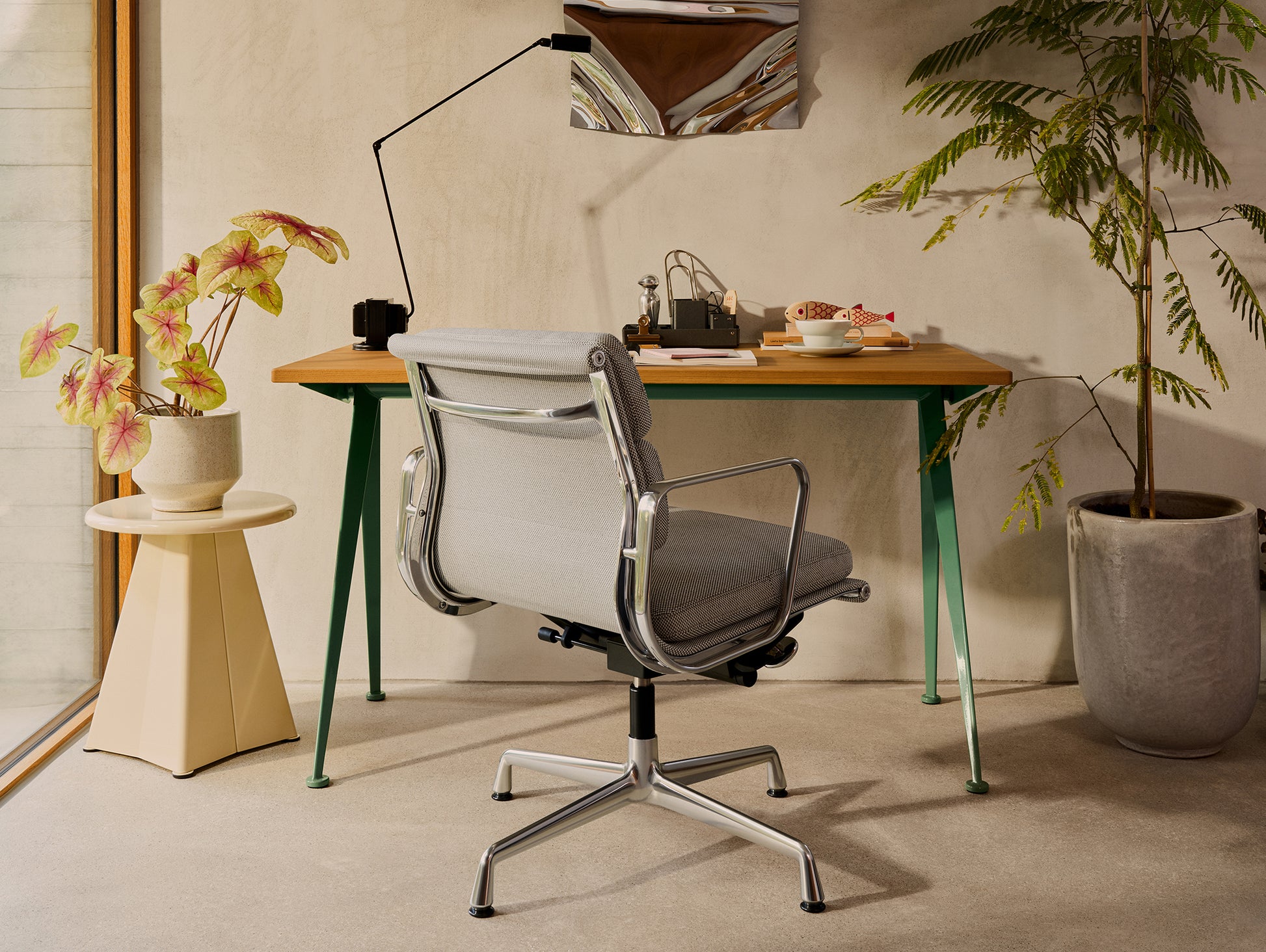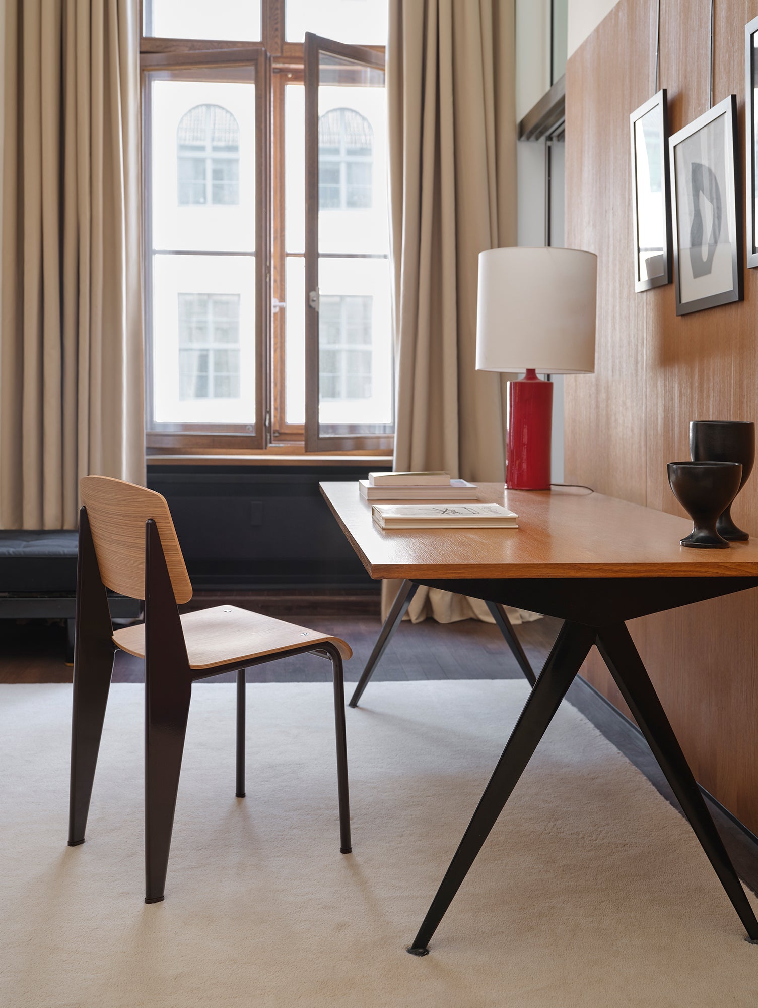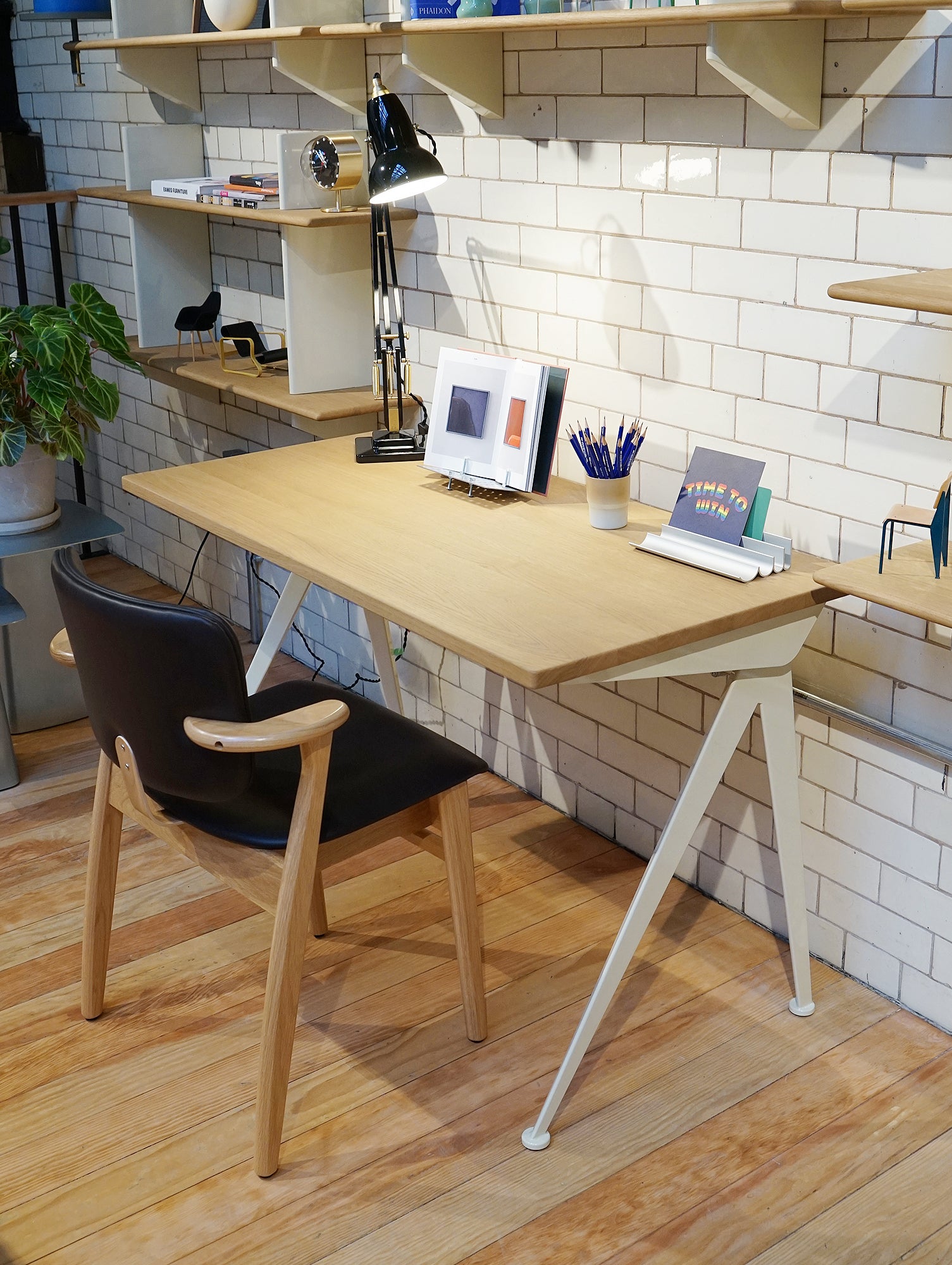 ジャン・プルーヴェは、1950 年頃に、彼が知られている構造原理に基づいたデザインを基にして、コンパス テーブルのいくつかのバージョンを開発しました。それらすべてに共通するのは、フランス語で「le compa」という意味のコンパスのヒンジ付きアームを思い起こさせる、金属製の細くてエレガントに広がった脚です。オーク材またはクルミ材の無垢材のテーブルトップとスチール製の脚とフレームで作られた Compas Direction は、堅牢で安定したデザインで、プルーヴェのクラシックであることが簡単にわかります。無垢材のテーブルトップがデスクに個性を与えます。コンパクトなサイズのデスクは、現代のホームオフィスに最適です。外観を完成させるには、コンパス ディレクションをスタンダード チェアまたはフォートゥイユ ディレクション チェアと組み合わせることをお勧めします。