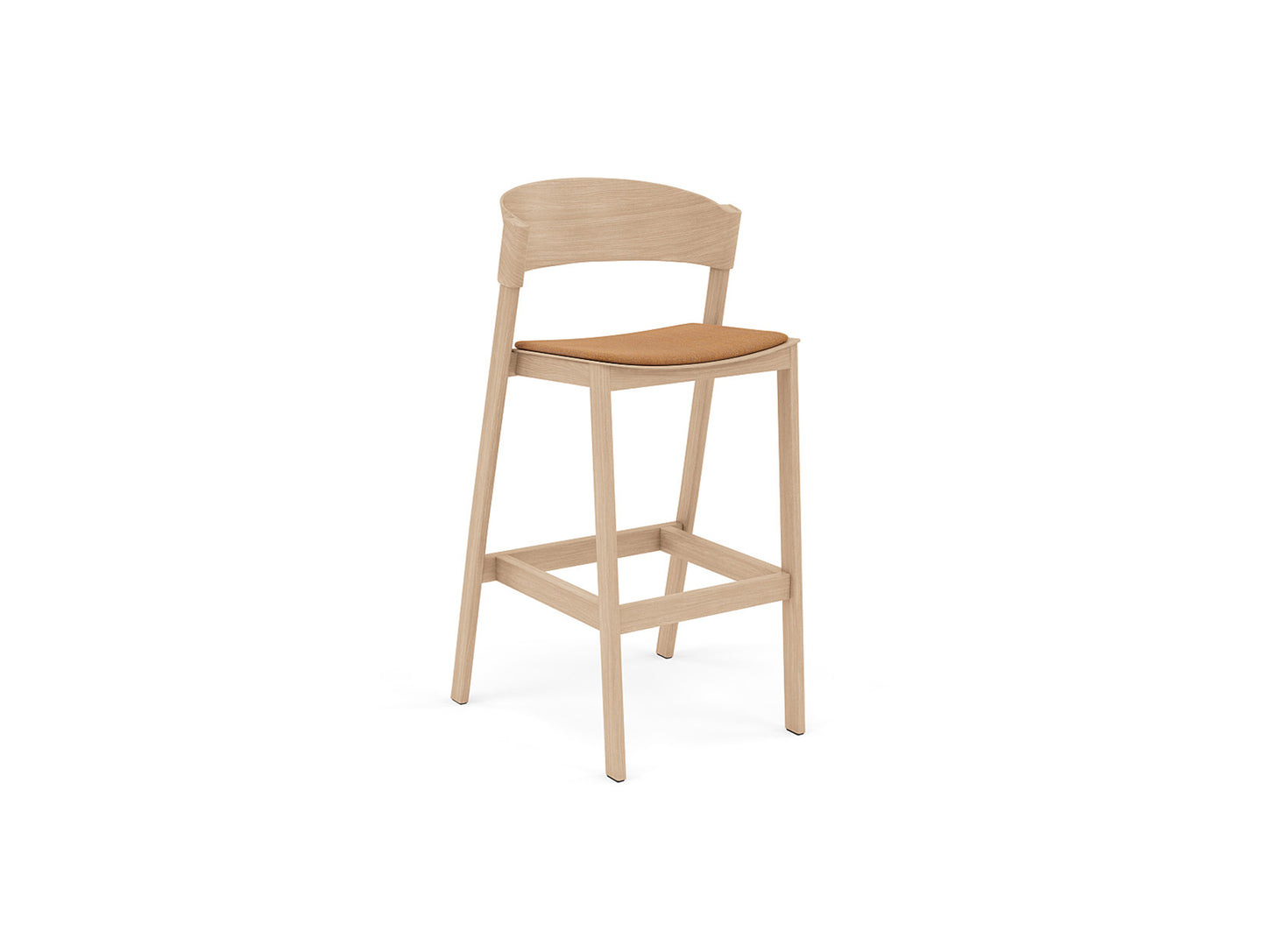The back and seat of the Cover Stool are made from form-pressed oak laminated shell, alongside its legs in solid oak, all in a water-based lacquer. Pre-mounted plastic glides are included.