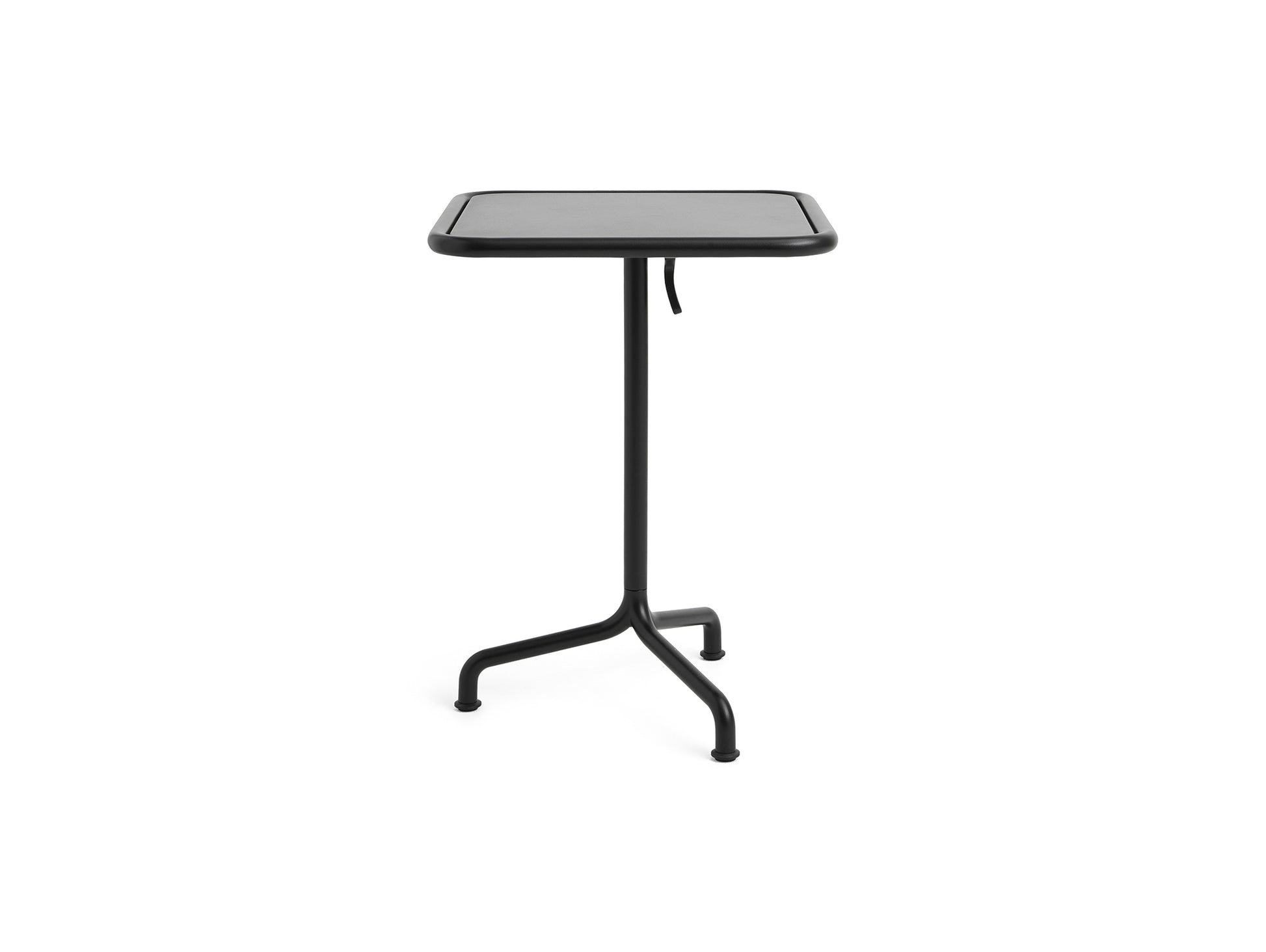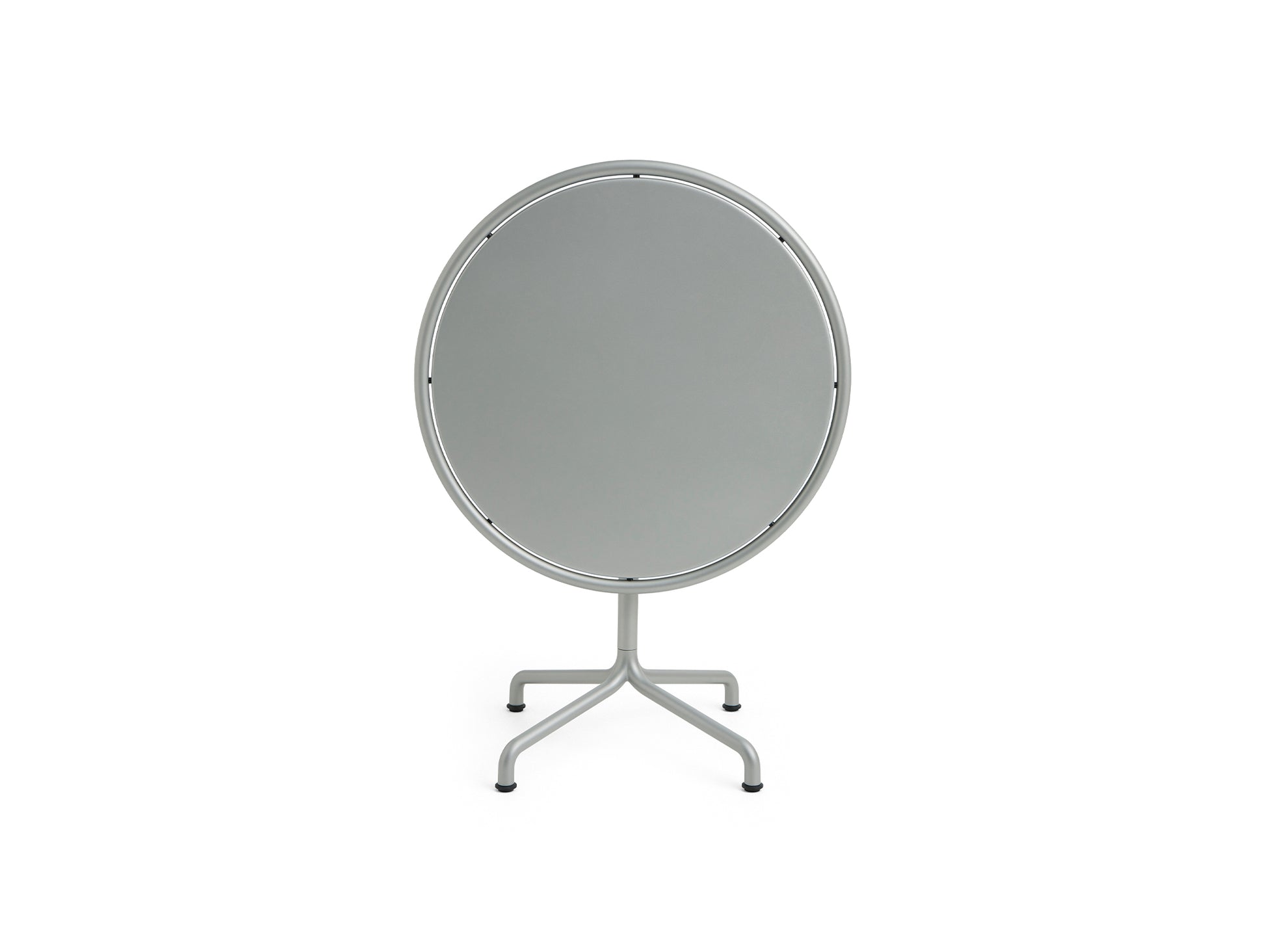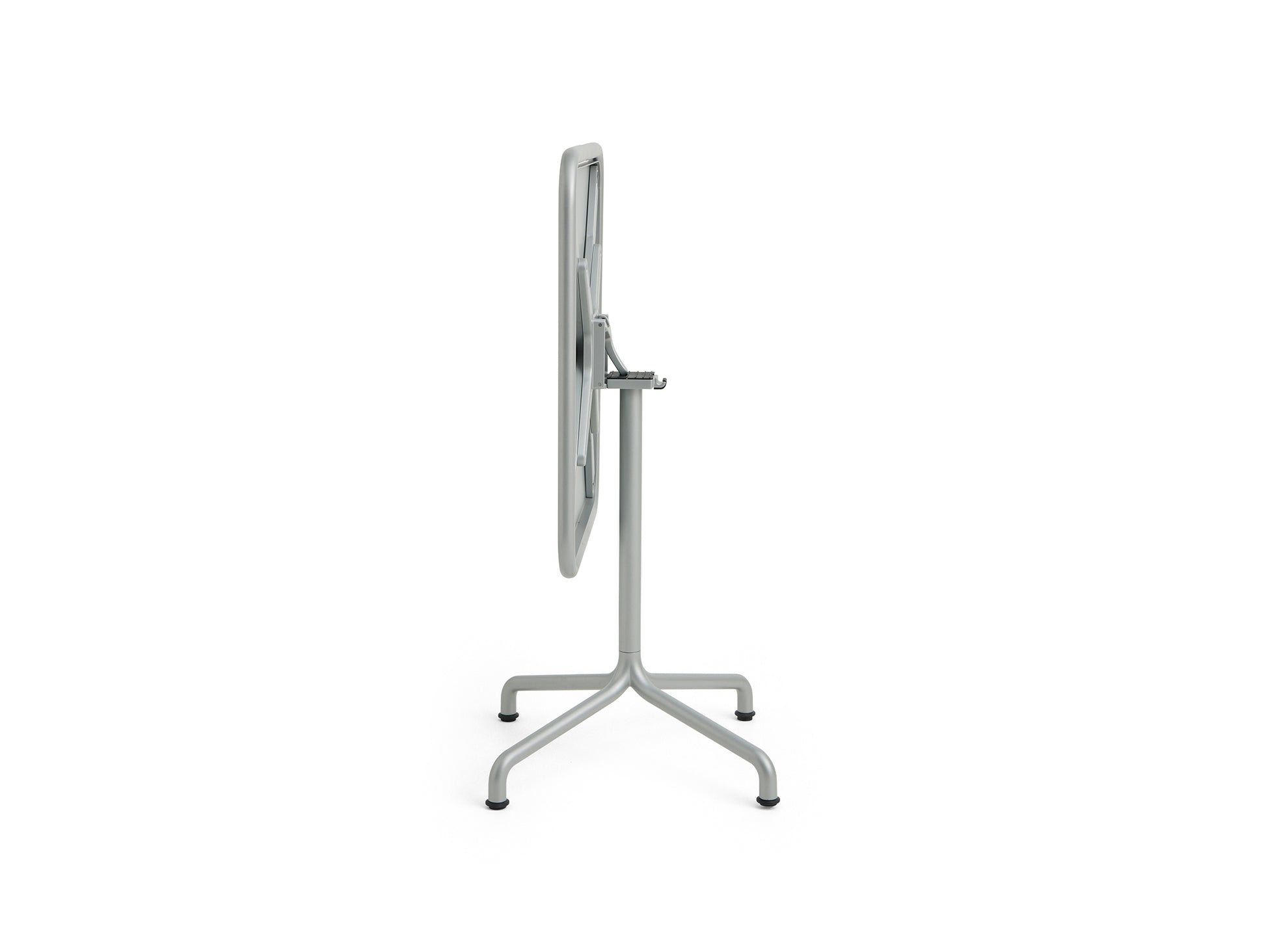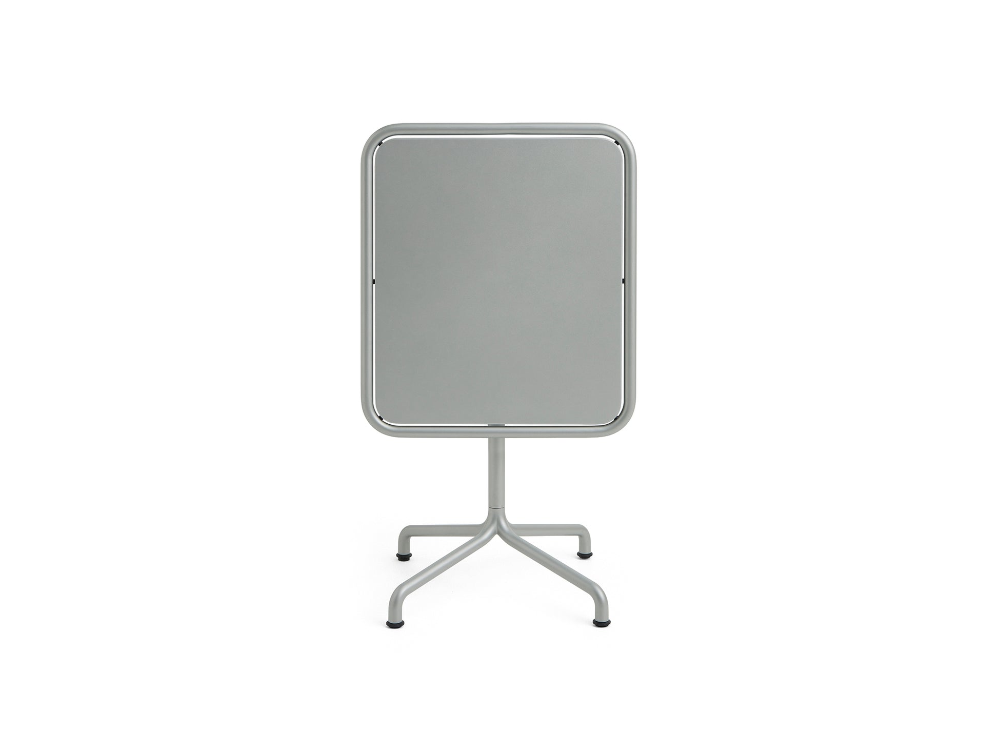 Crafted from at least 60% post-consumer recycled aluminium, the rust-resistant table is built to last. The table features a steel tabletop with an integrated tilting mechanism and a die-cast aluminium base, finished with a durable powder-coated surface for outdoor use. An integrated locking mechanism secures the tabletop both in use and when folded. When folded, the tabletop stands in a near-vertical position, allowing compact storage and keeping the table neatly positioned close to walls.