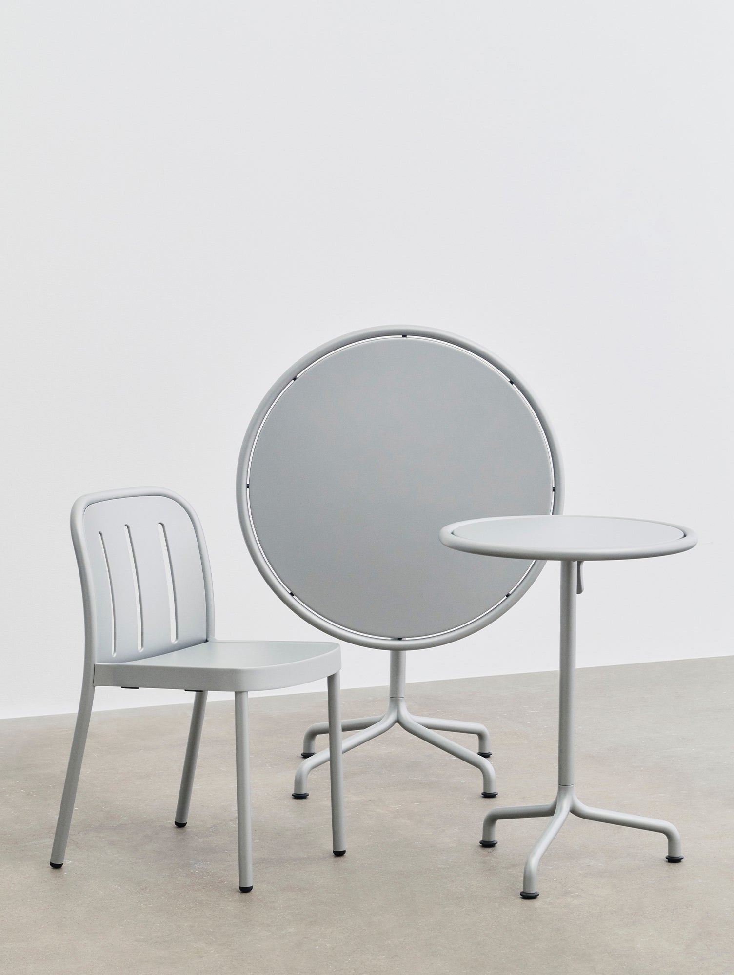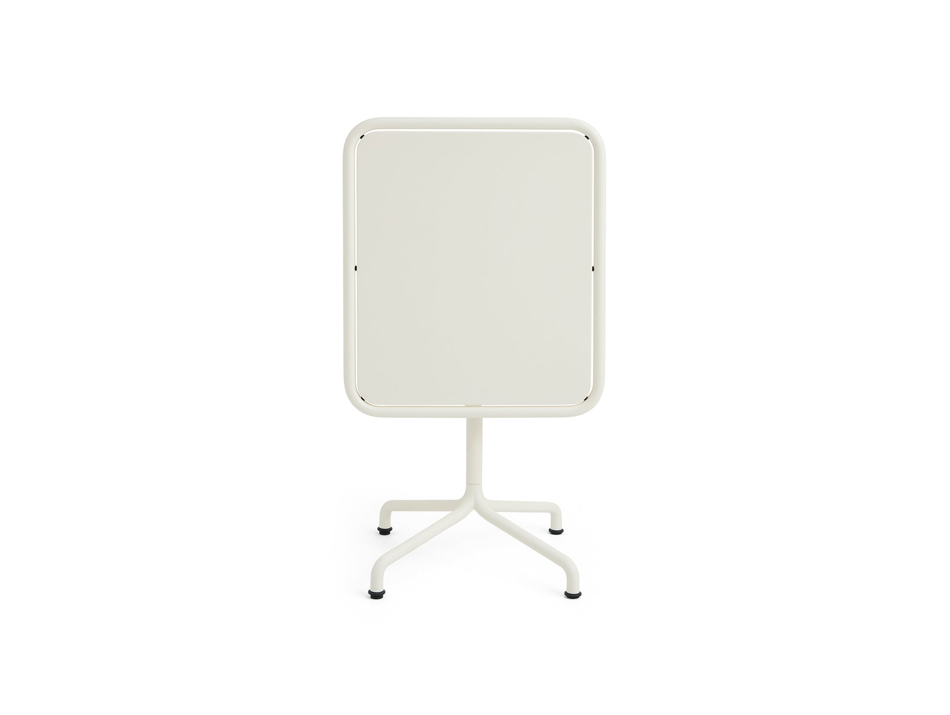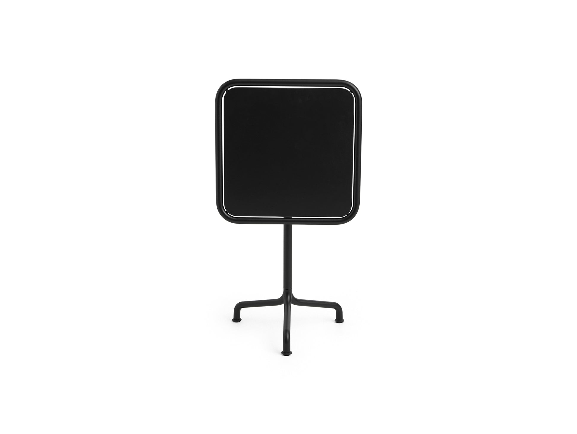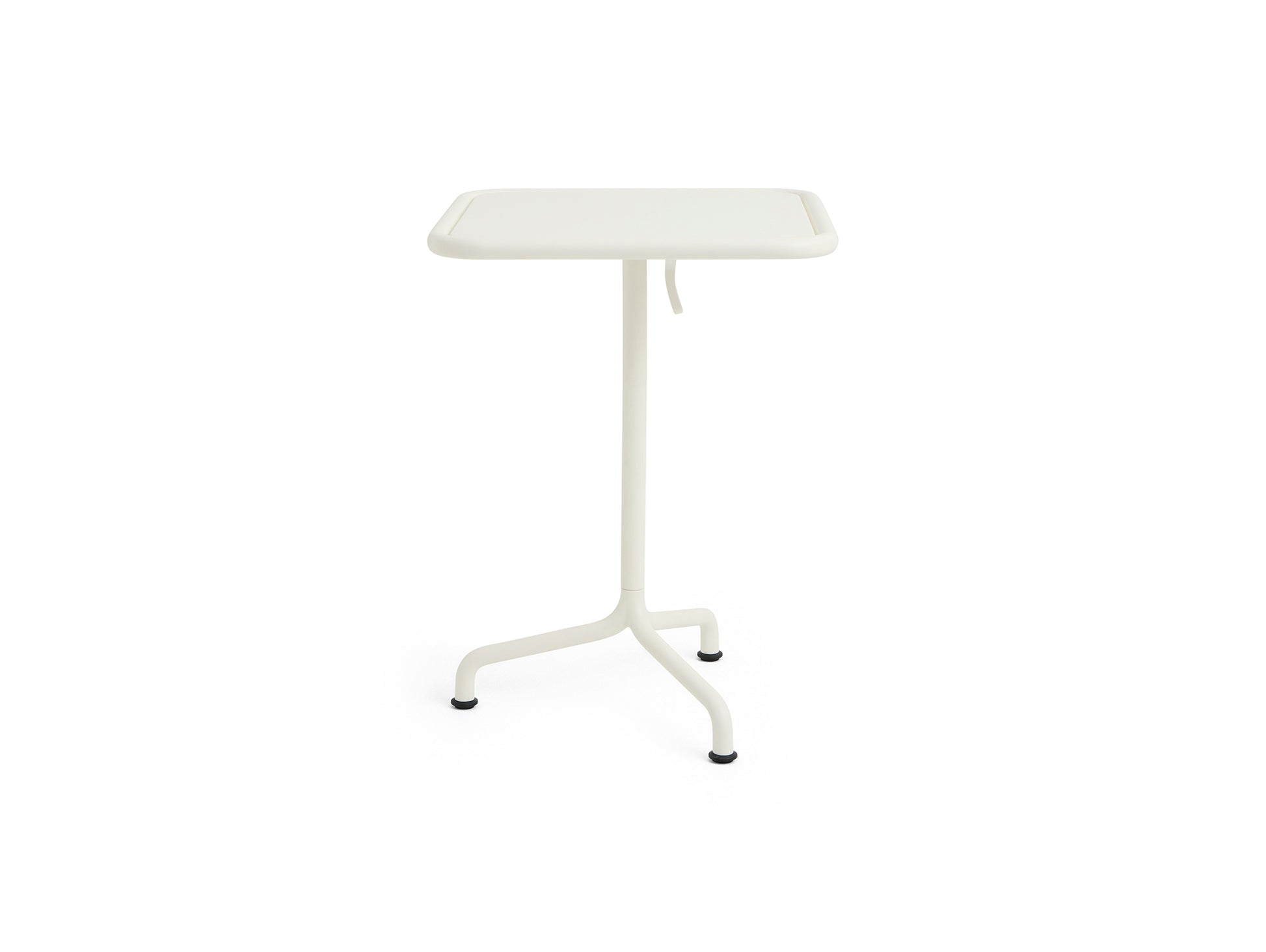 Crafted from at least 60% post-consumer recycled aluminium, the rust-resistant table is built to last. The table features a steel tabletop with an integrated tilting mechanism and a die-cast aluminium base, finished with a durable powder-coated surface for outdoor use. An integrated locking mechanism secures the tabletop both in use and when folded. When folded, the tabletop stands in a near-vertical position, allowing compact storage and keeping the table neatly positioned close to walls.