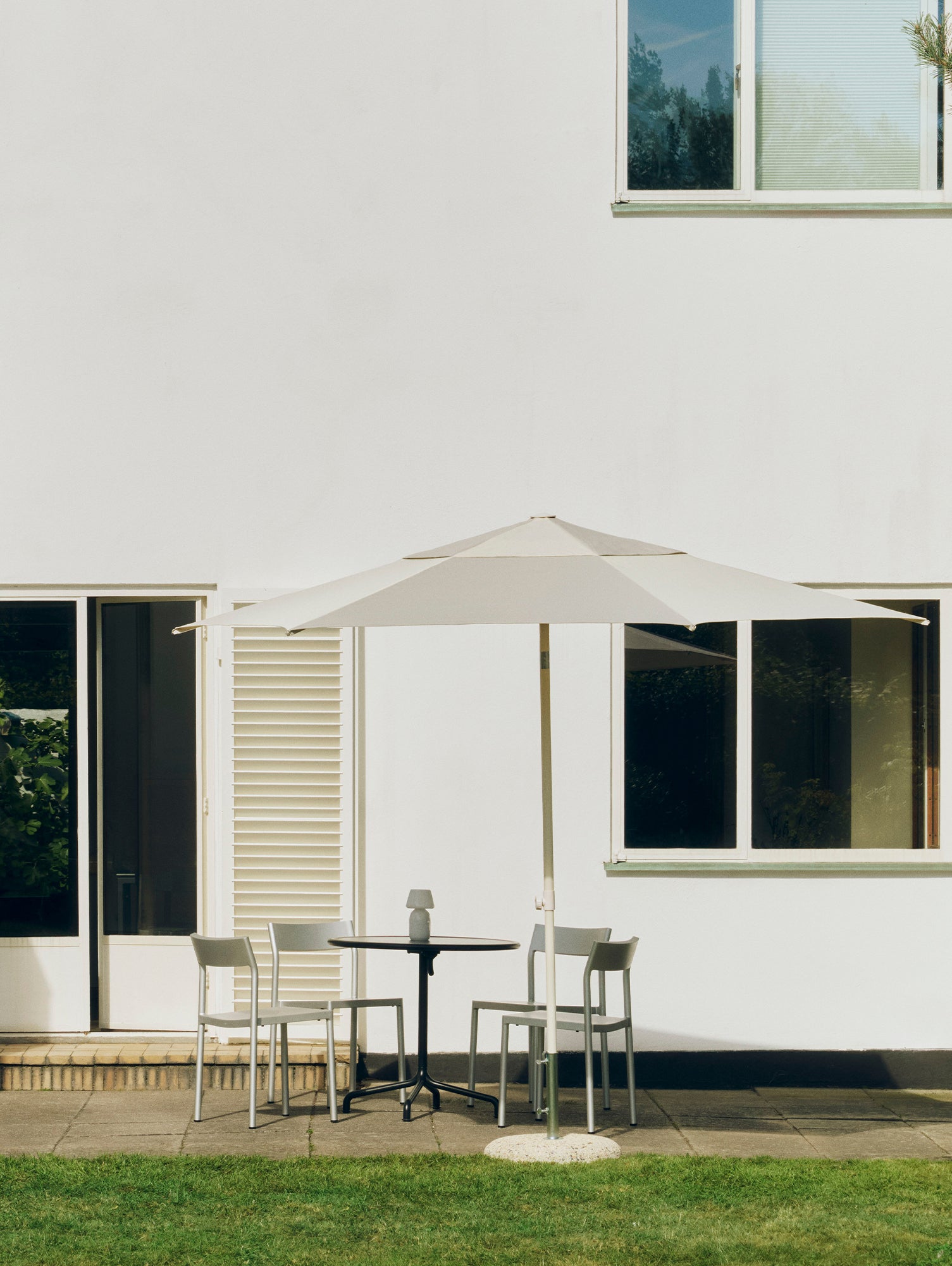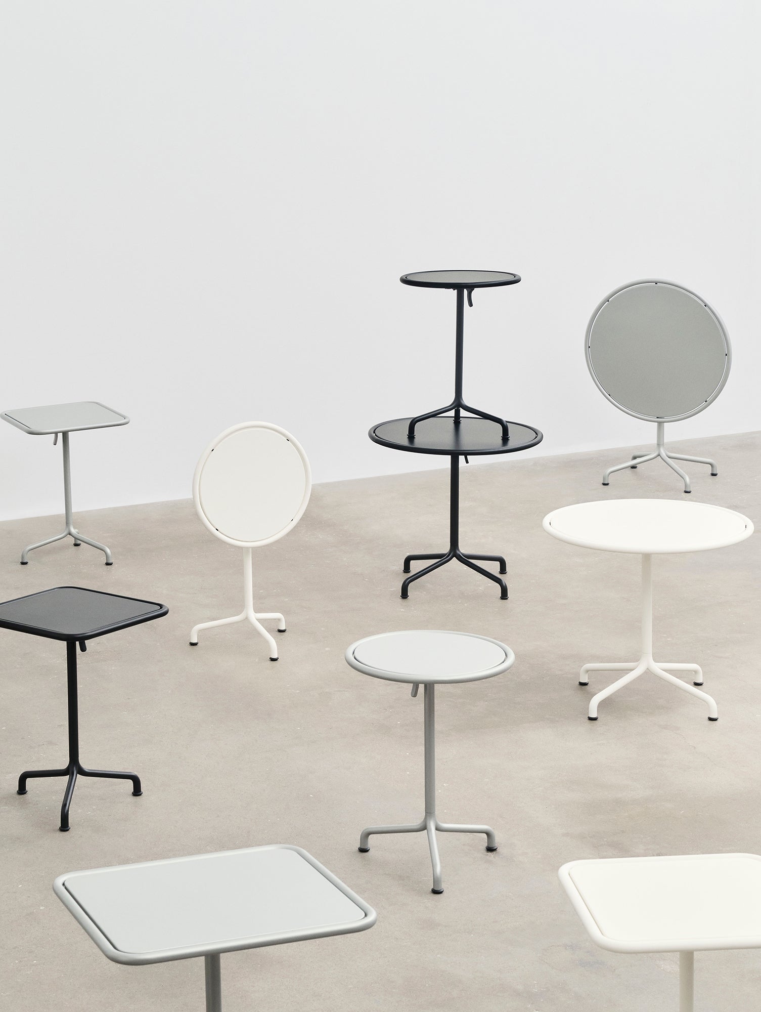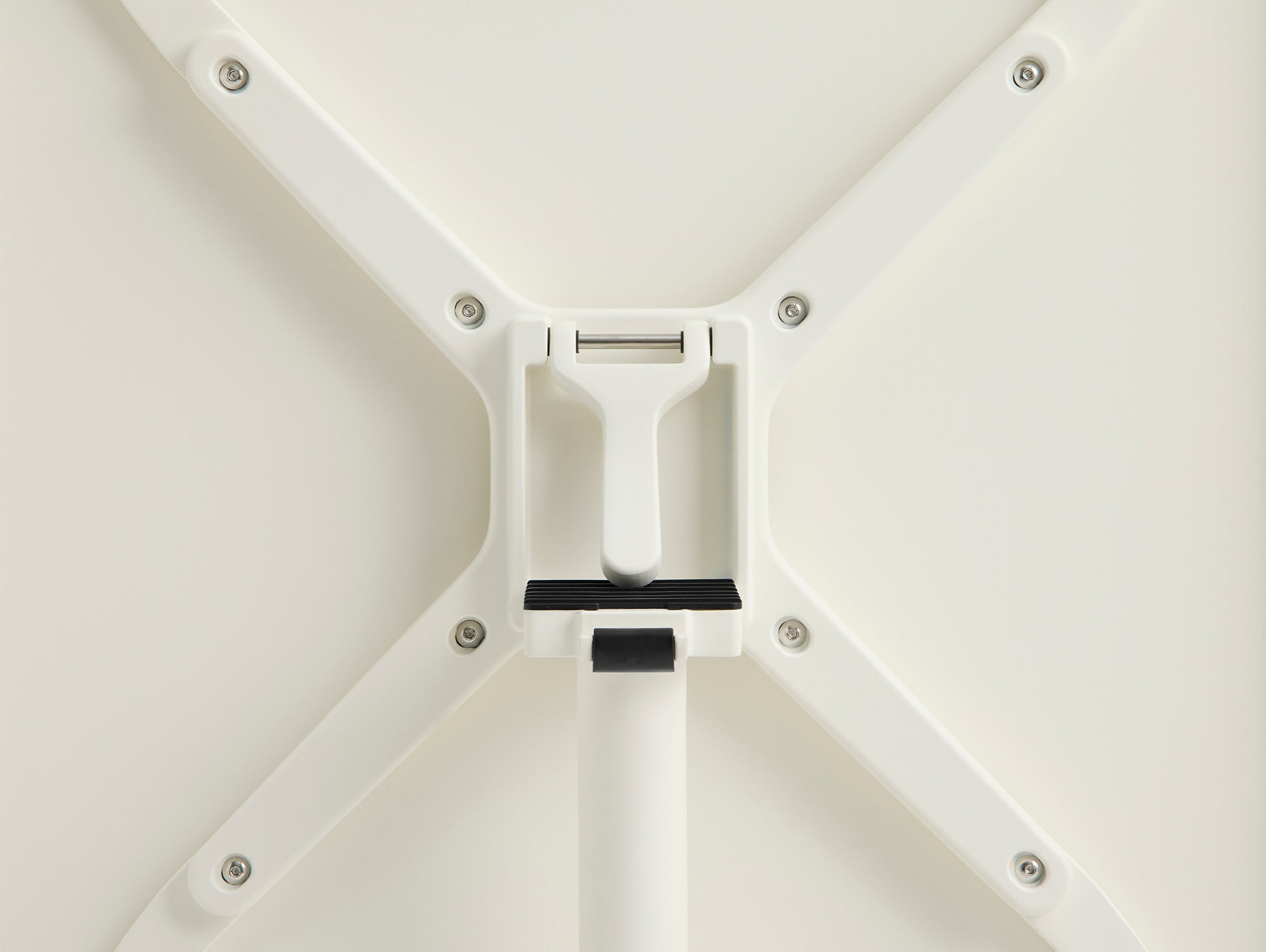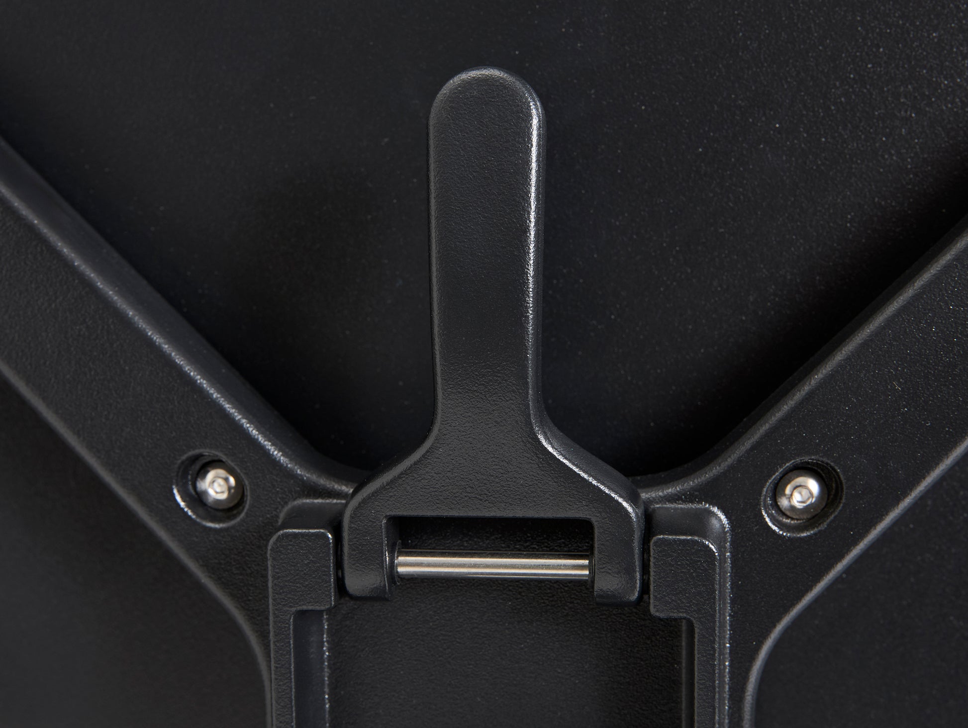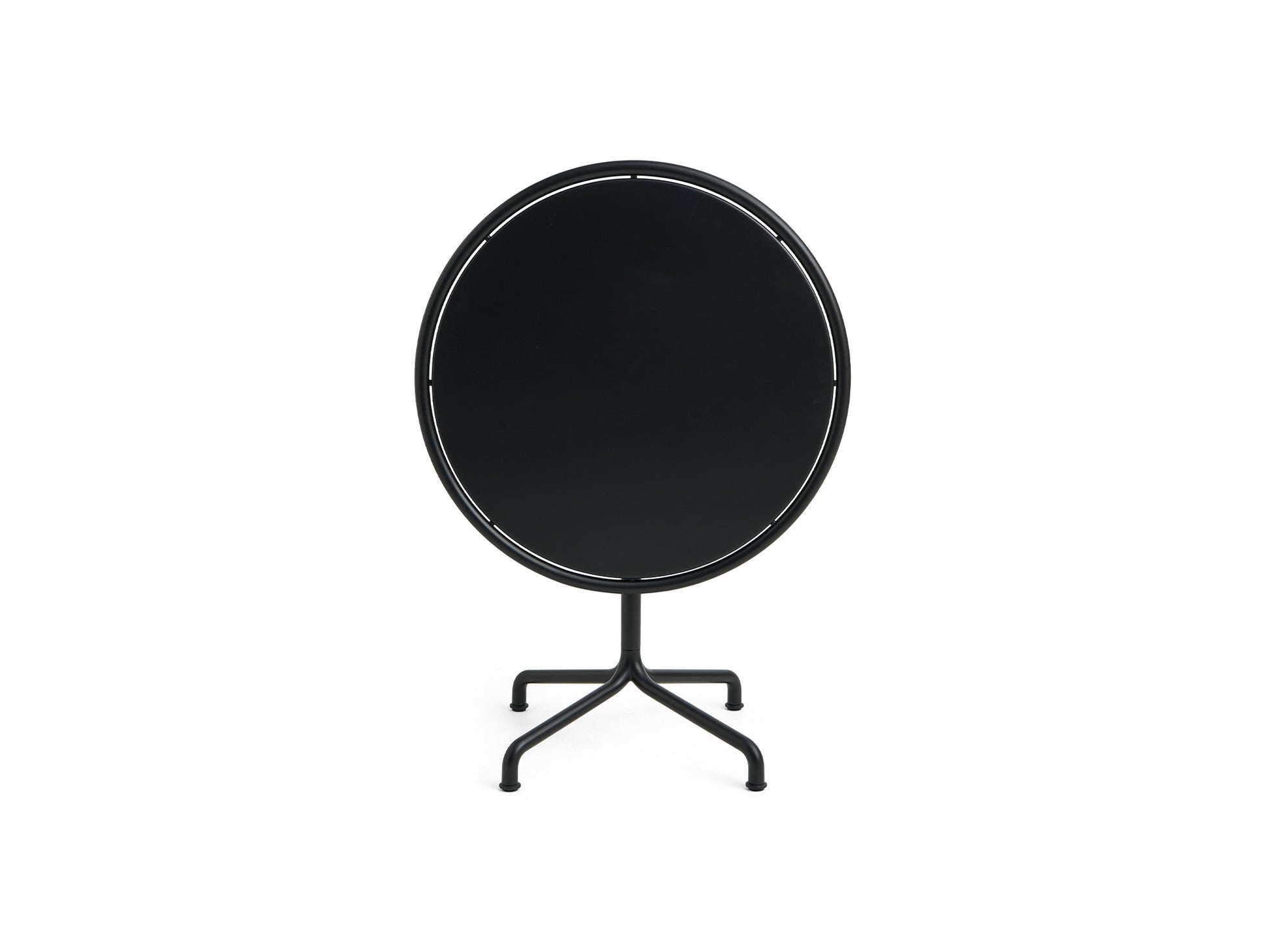 Crafted from at least 60% post-consumer recycled aluminium, the rust-resistant table is built to last. The table features a steel tabletop with an integrated tilting mechanism and a die-cast aluminium base, finished with a durable powder-coated surface for outdoor use. An integrated locking mechanism secures the tabletop both in use and when folded. When folded, the tabletop stands in a near-vertical position, allowing compact storage and keeping the table neatly positioned close to walls.