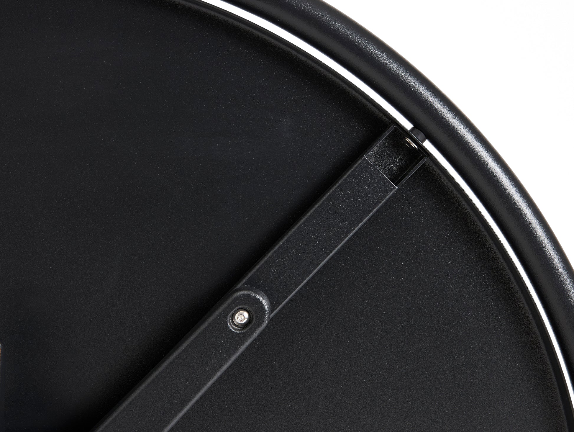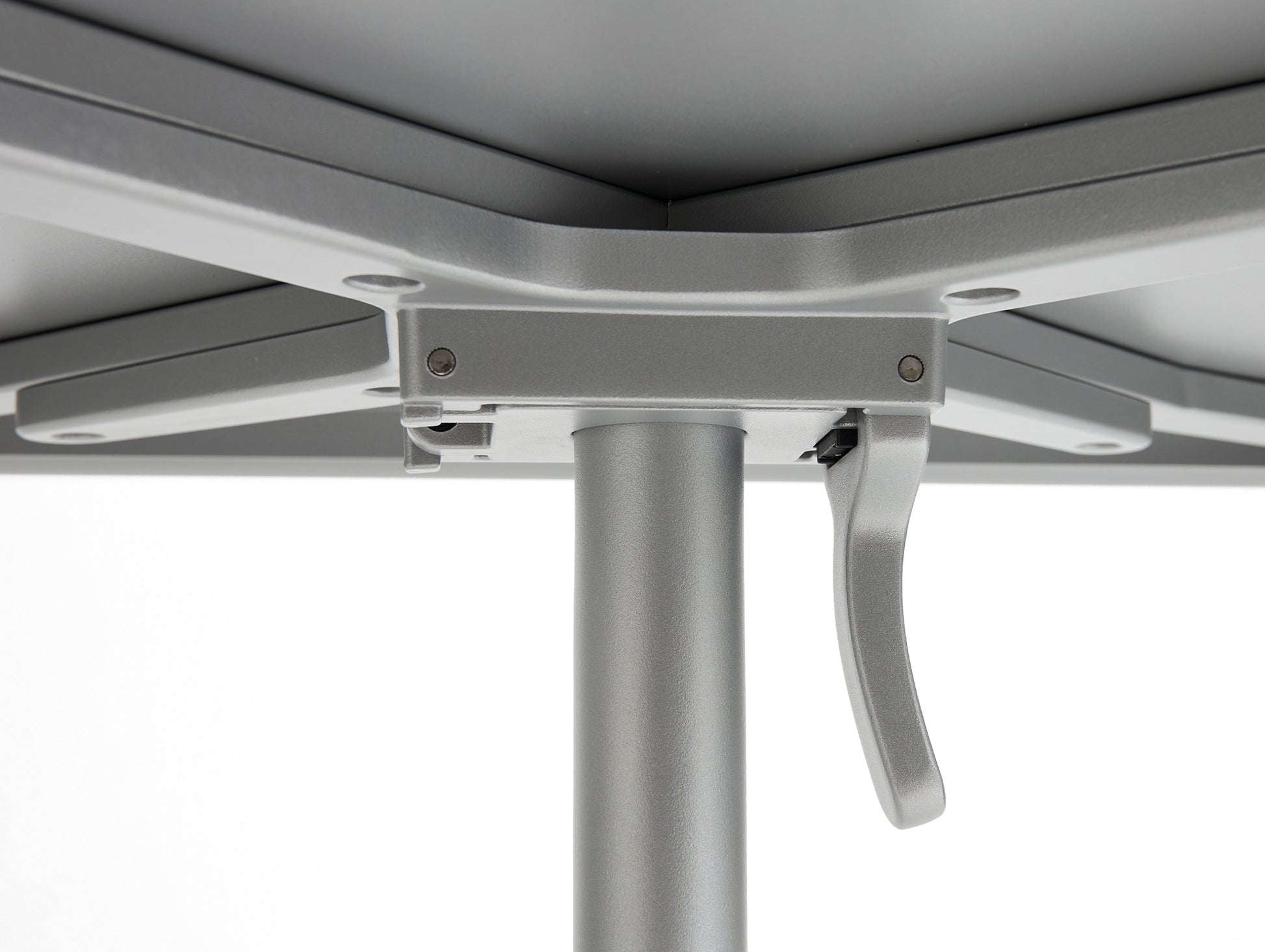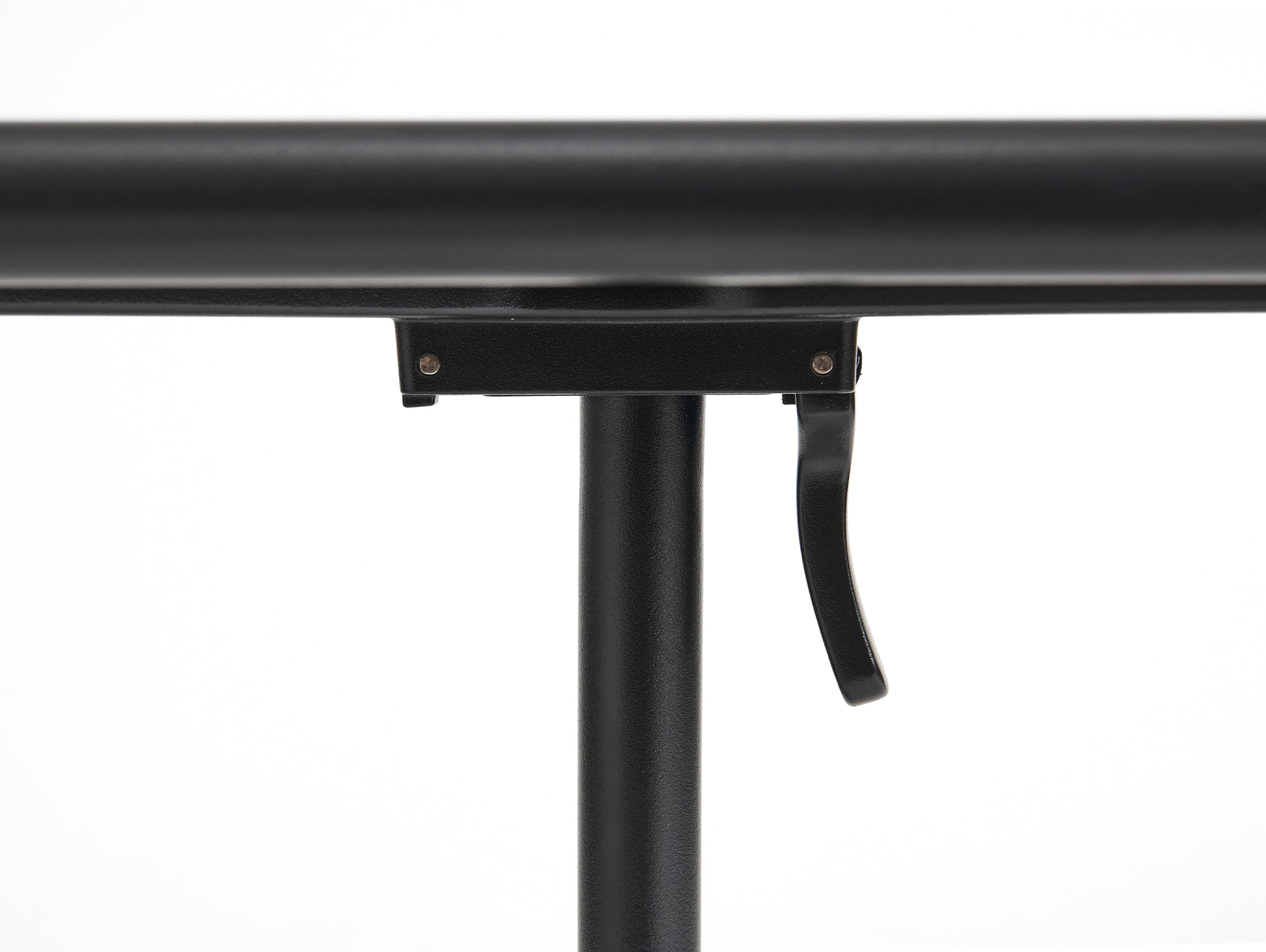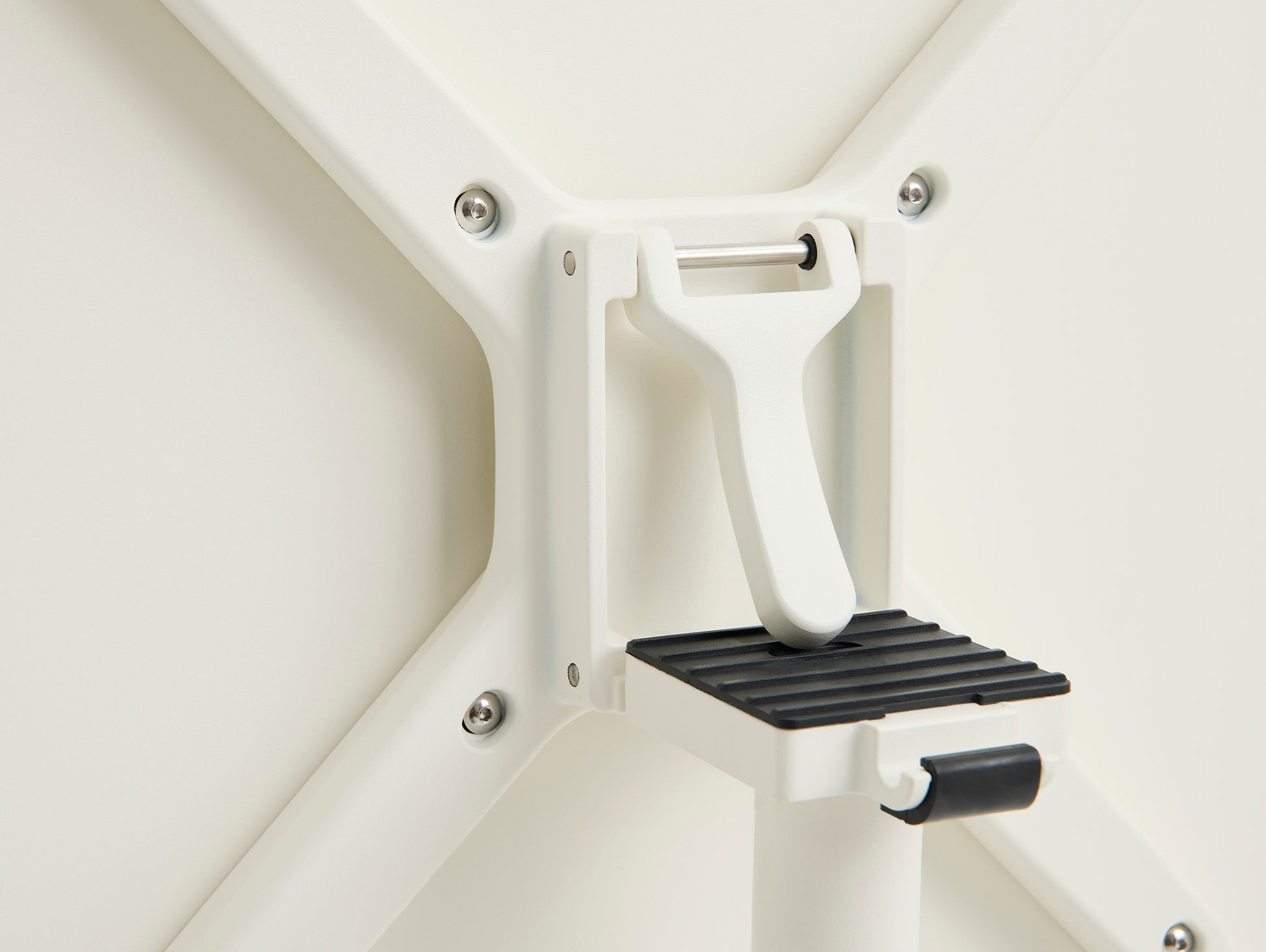 Crafted from at least 60% post-consumer recycled aluminium, the rust-resistant table is built to last. The table features a steel tabletop with an integrated tilting mechanism and a die-cast aluminium base, finished with a durable powder-coated surface for outdoor use. An integrated locking mechanism secures the tabletop both in use and when folded. When folded, the tabletop stands in a near-vertical position, allowing compact storage and keeping the table neatly positioned close to walls.