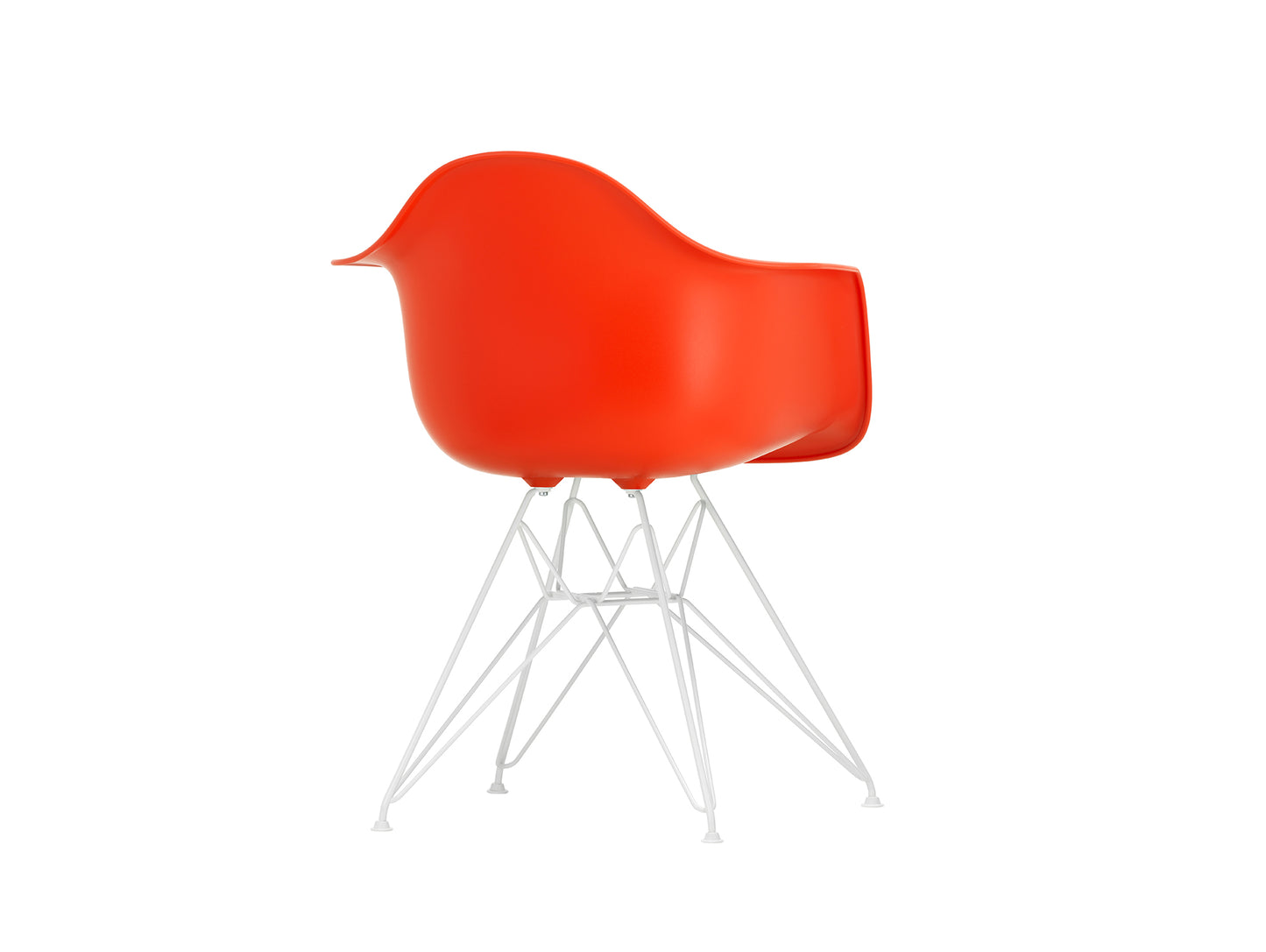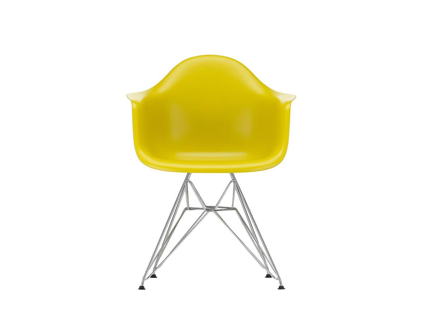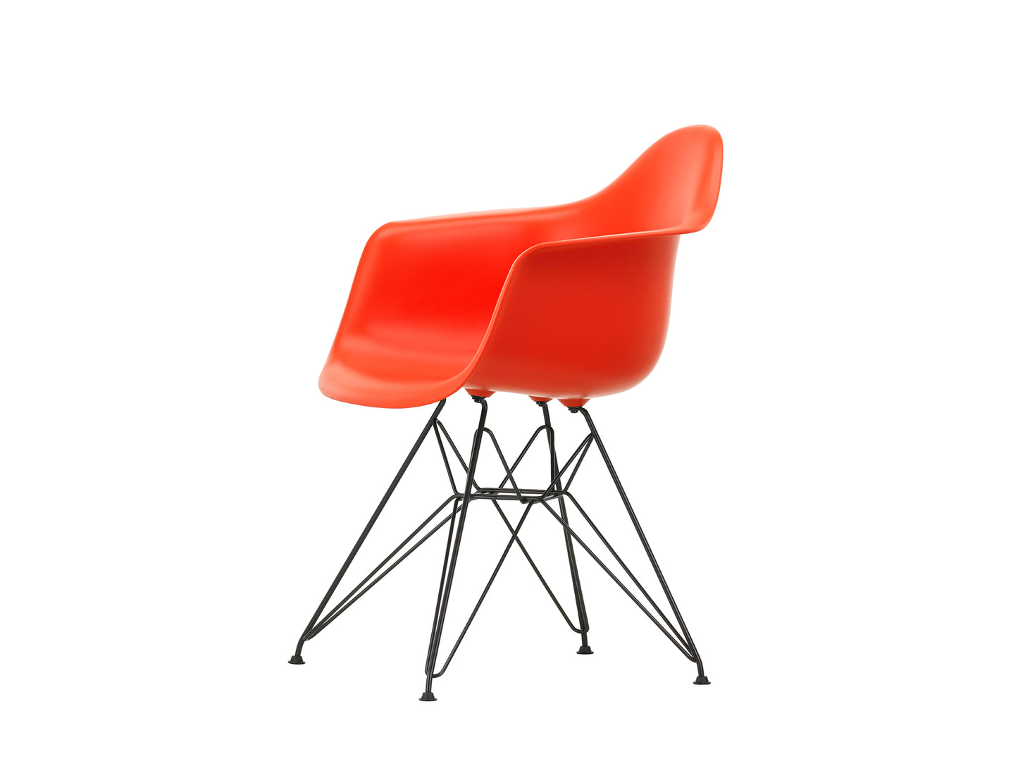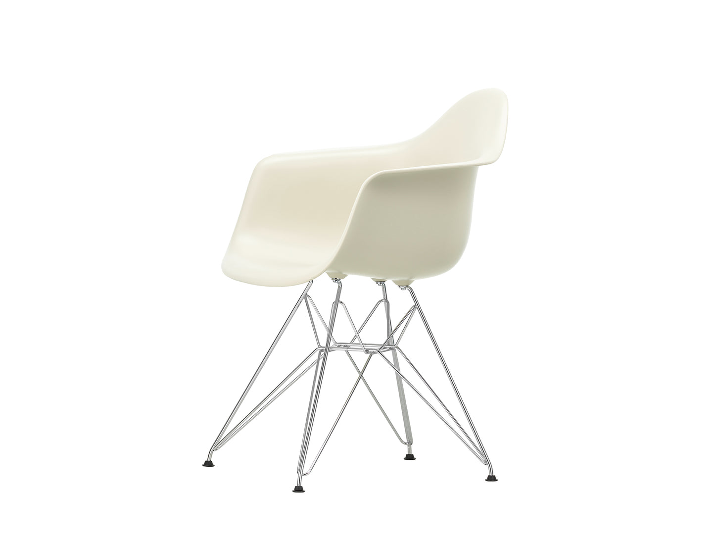イームズ DAR プラスチック アームチェア RE は、クロームメッキの「エッフェル塔」スタイルの脚ベースを備えた、伝説的なグラスファイバー椅子の現代版です。これは、ニューヨーク近代美術館の低コスト家具デザイン コンペティションでゼニス プラスチックスと共同で製作されたもので、世界初の工業的に製造されたプラスチック製の椅子でした。