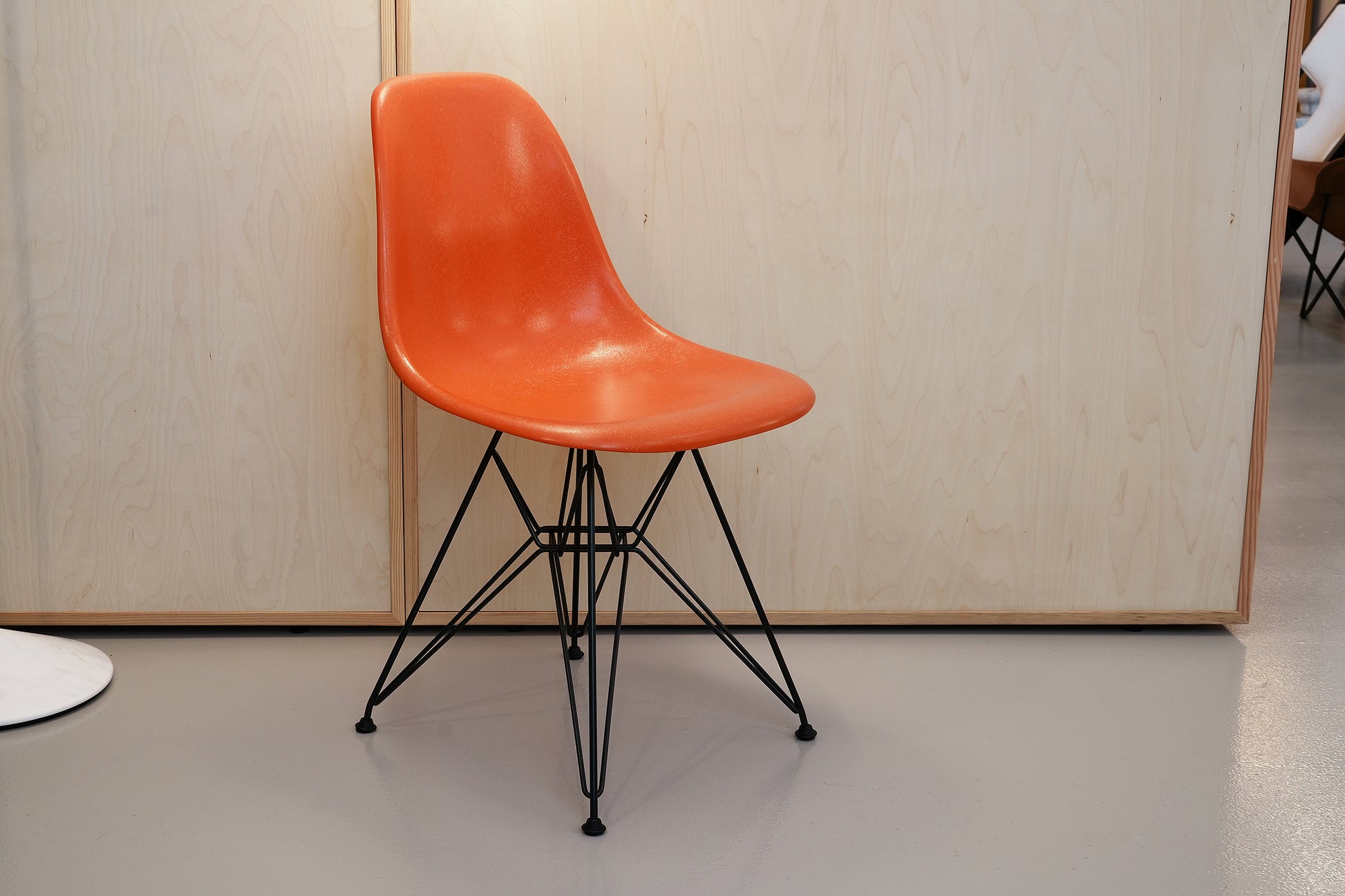 夫妻は代替材料を模索した結果、最終的にガラス繊維強化ポリエステル樹脂に行き着いたが、それまで主に航空機のレドームやコックピットカバーなどの軍事用途に限定されていた。イームズ夫妻は、成形性、剛性、工業的製造方法への適合性といったグラスファイバーの利点を認識し、最大限に活用しました。家具業界ではこれまで知られていなかったこの素材を使用して、大量生産向けの成形シートシェルの開発に成功し、ファイバーグラスチェアが誕生しました。その有機的な形状の一体型シェルは、椅子が通常座面と背もたれで構成されていた当時、非常に賞賛された革新的であることが証明されました。グラスファイバーは、快適な触感と、最適な快適さを実現する完璧な成形フォームというさらなる利点を提供しました。