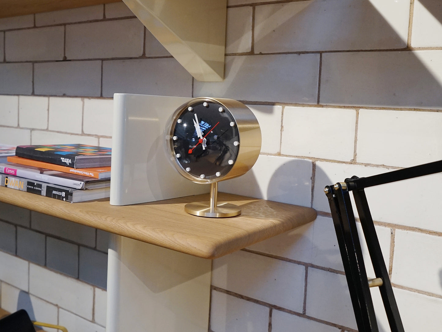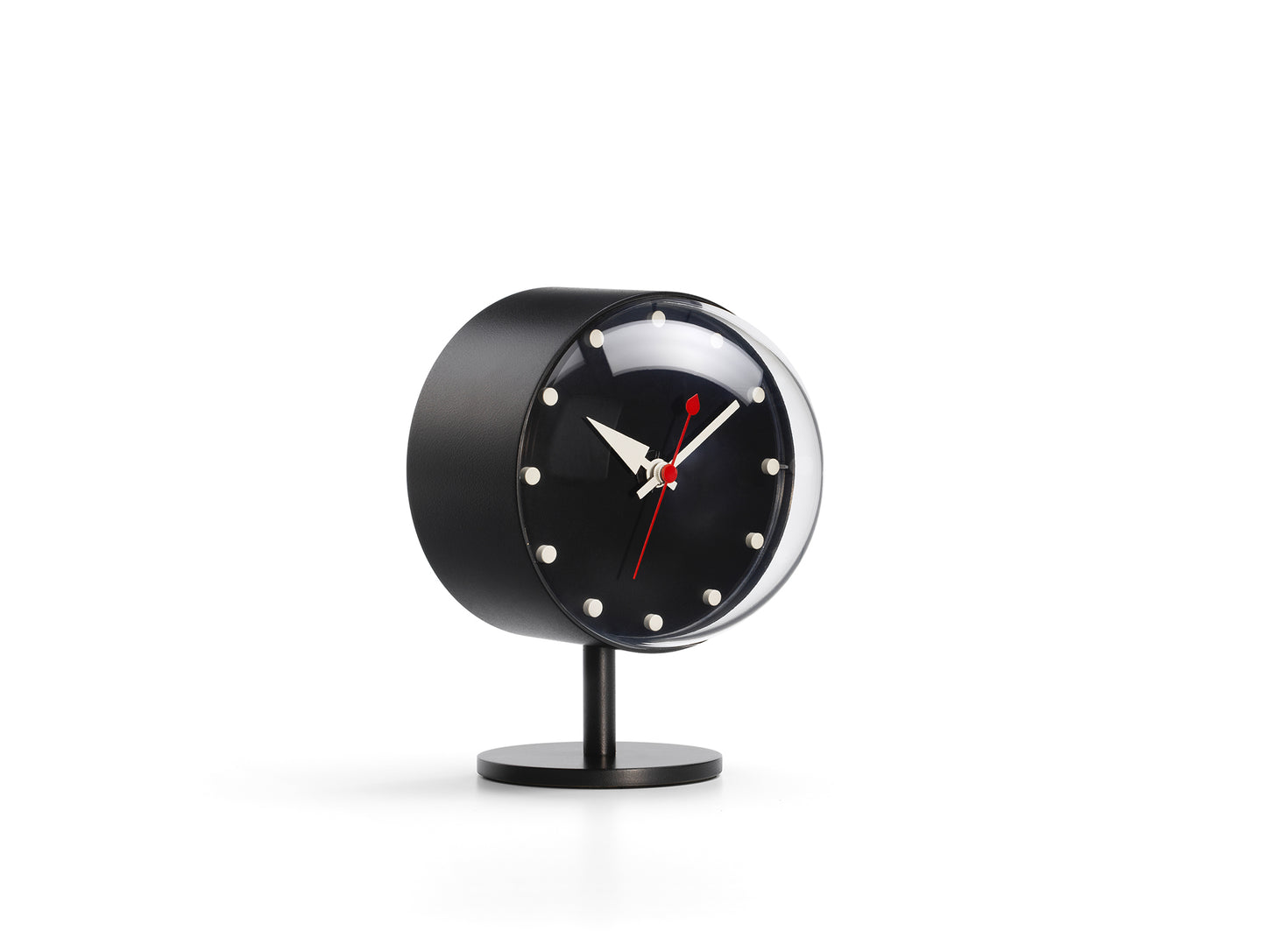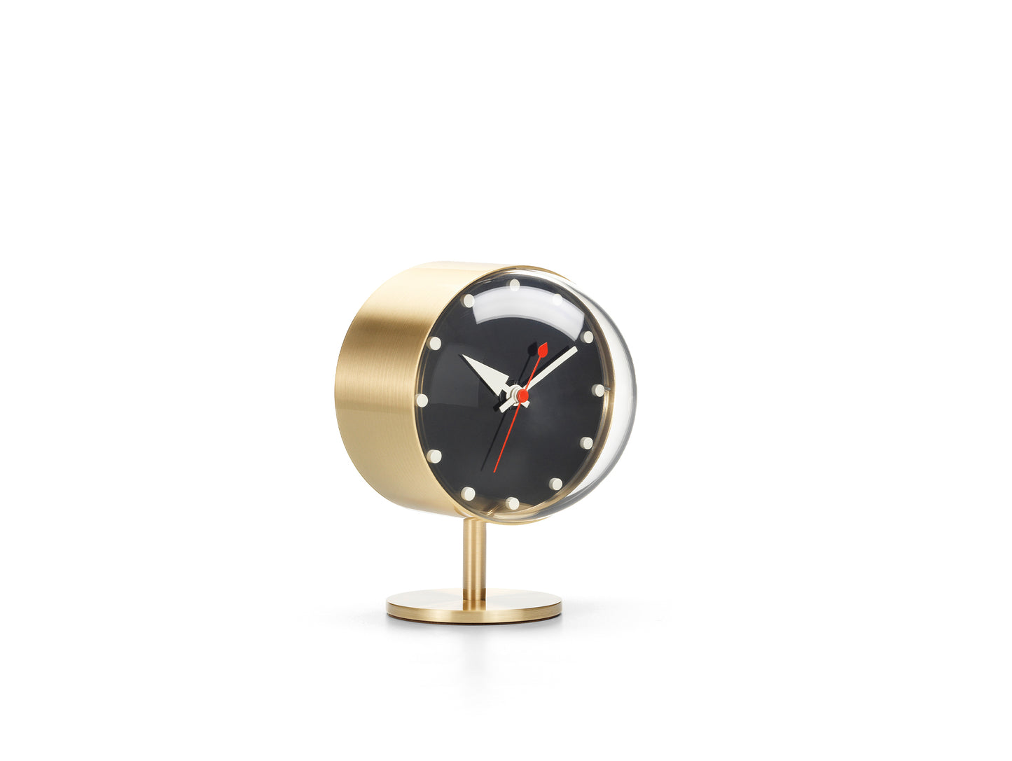 ヴィトラ ナイト クロックはジョージ ネルソンによってデザインされました。ナイトクロックは真鍮またはスチールで作られ、半球のアクリルガラスが付いています。球根状のガラスと円筒形の真鍮製ケースの象徴的な組み合わせが、この時計にユニークなシルエットを生み出しています。高品質のクォーツ ムーブメントを搭載しており、一般的には面白くないデスクトップ時計の完璧な代替品となります。
