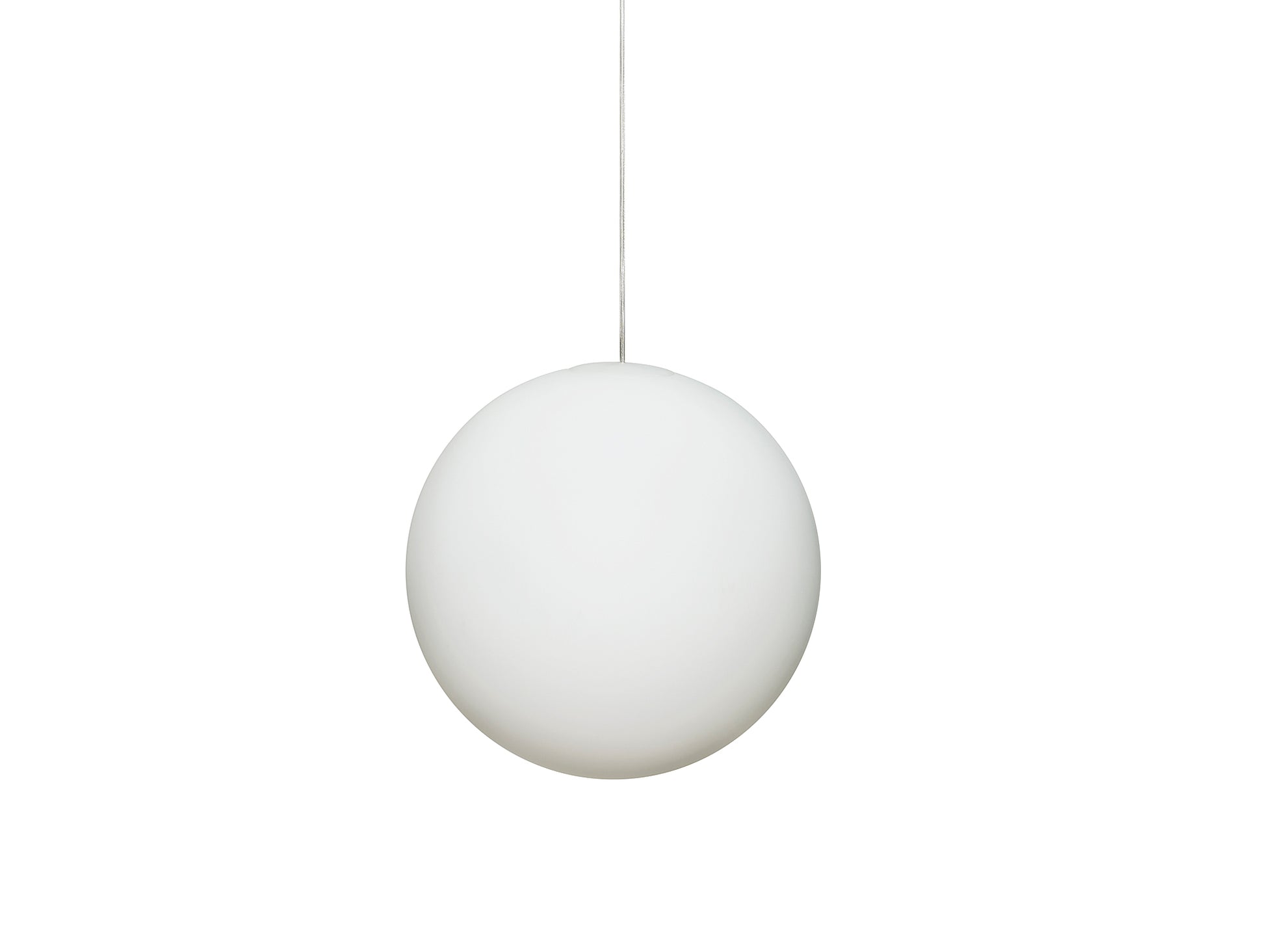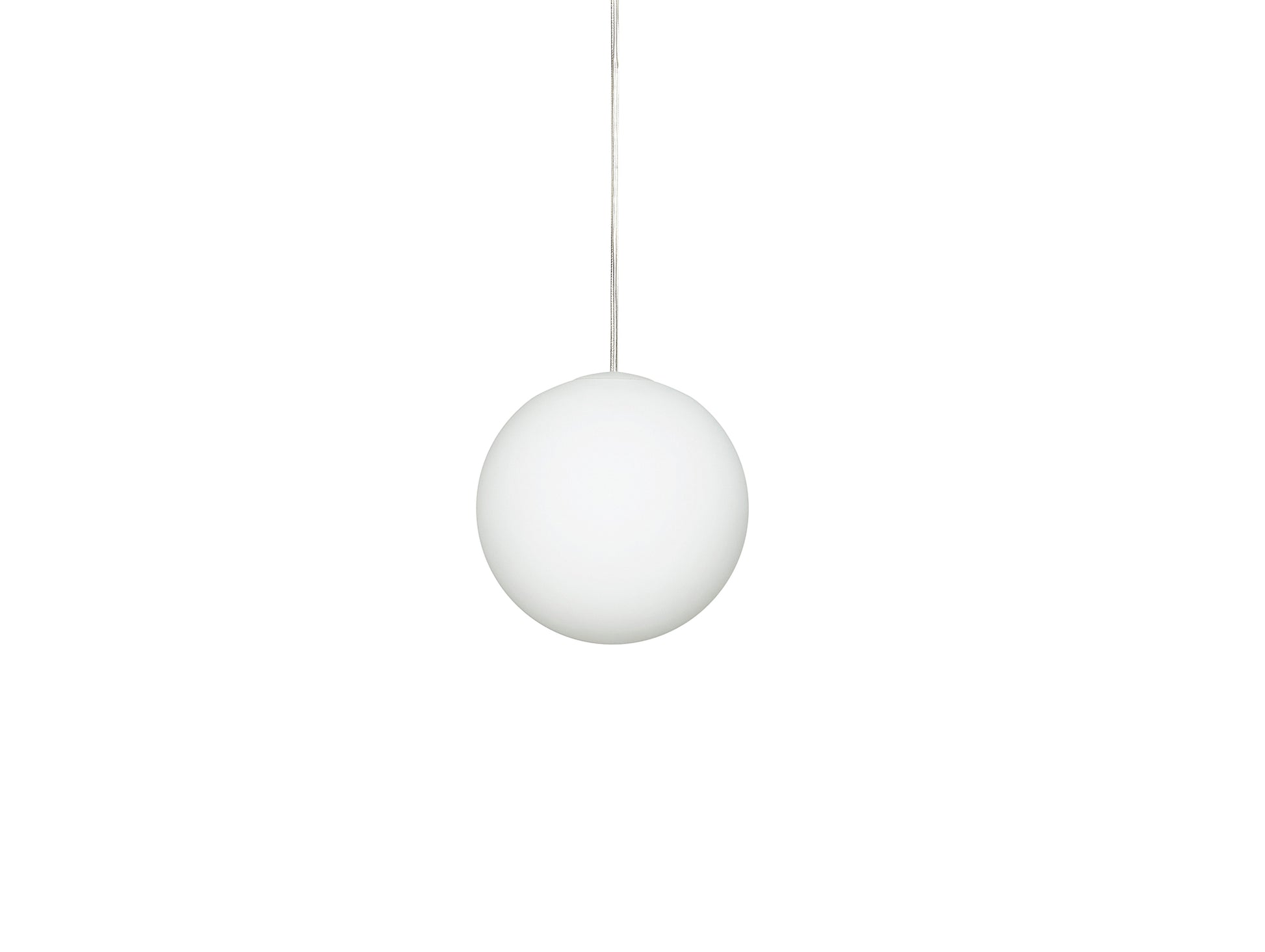 Mouth blown opal glass globe, transparent PVC-cord with steel wire core, acrylic cross.