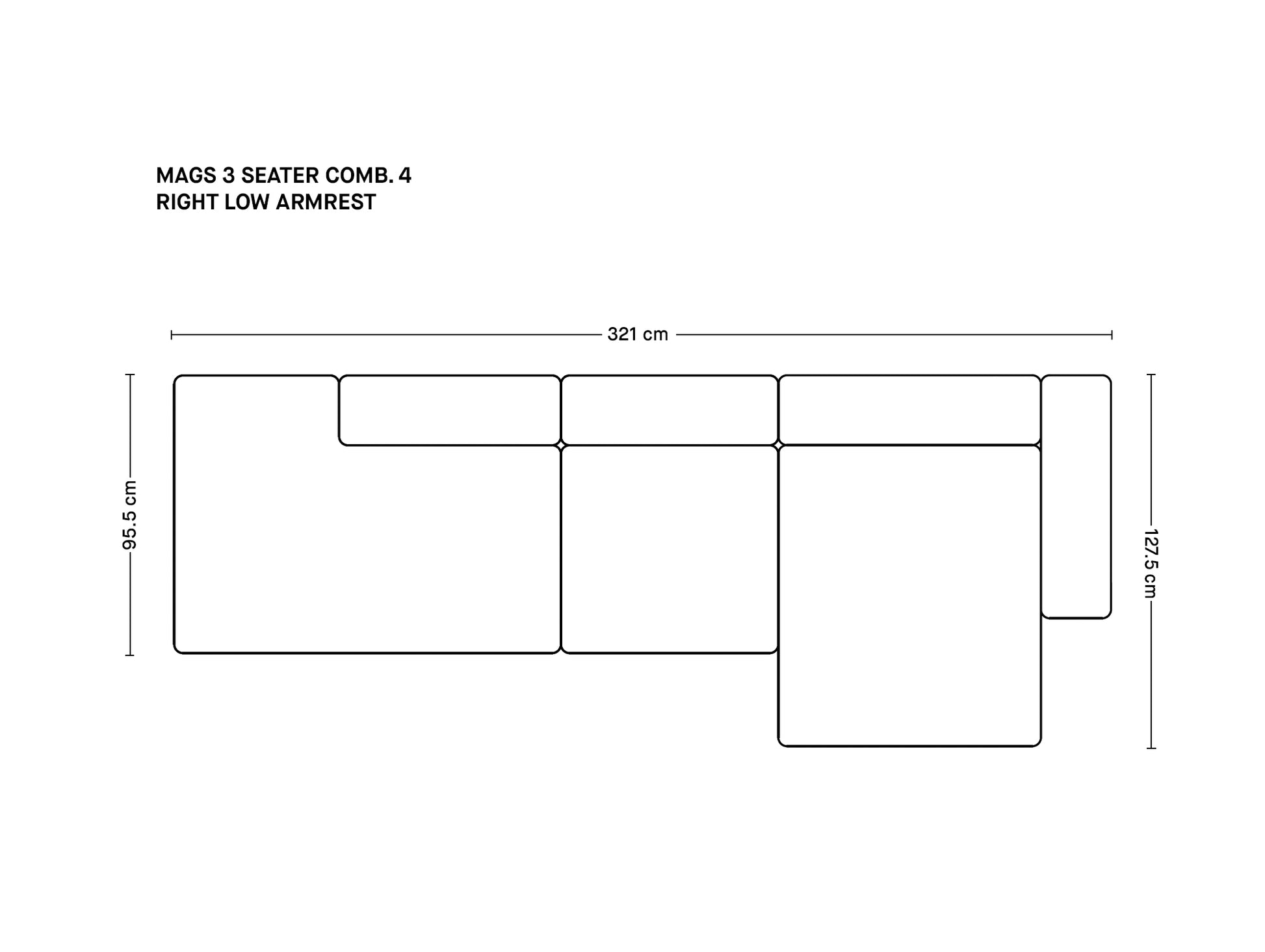 Combination 4 (Available with right side armrest or left side armrest) - Width: 321 cm, Depth: 127.5/95.5 cm, Height: 67 cm, Seat Height: 40 cm, Armrest Width: 24 cm, Armrest Height: 57 cm