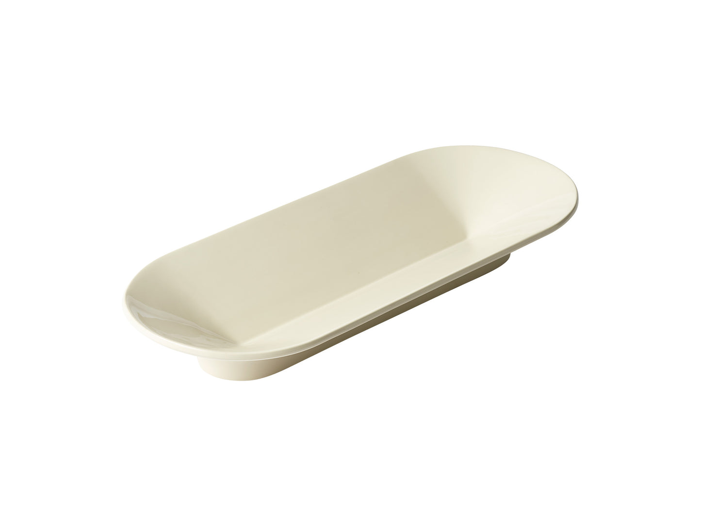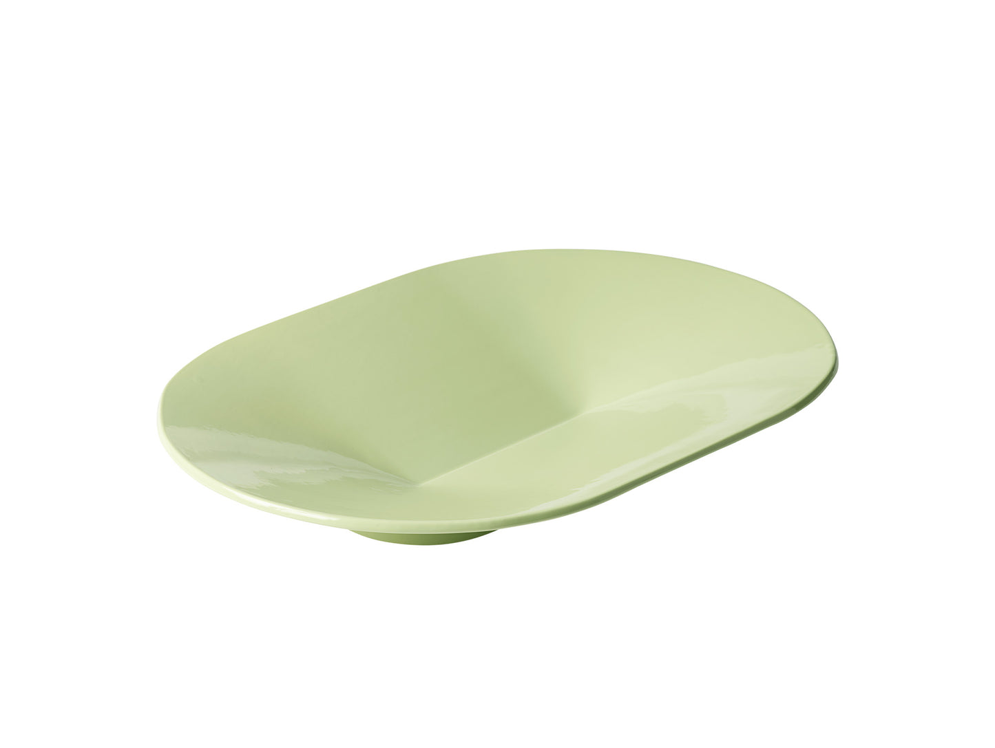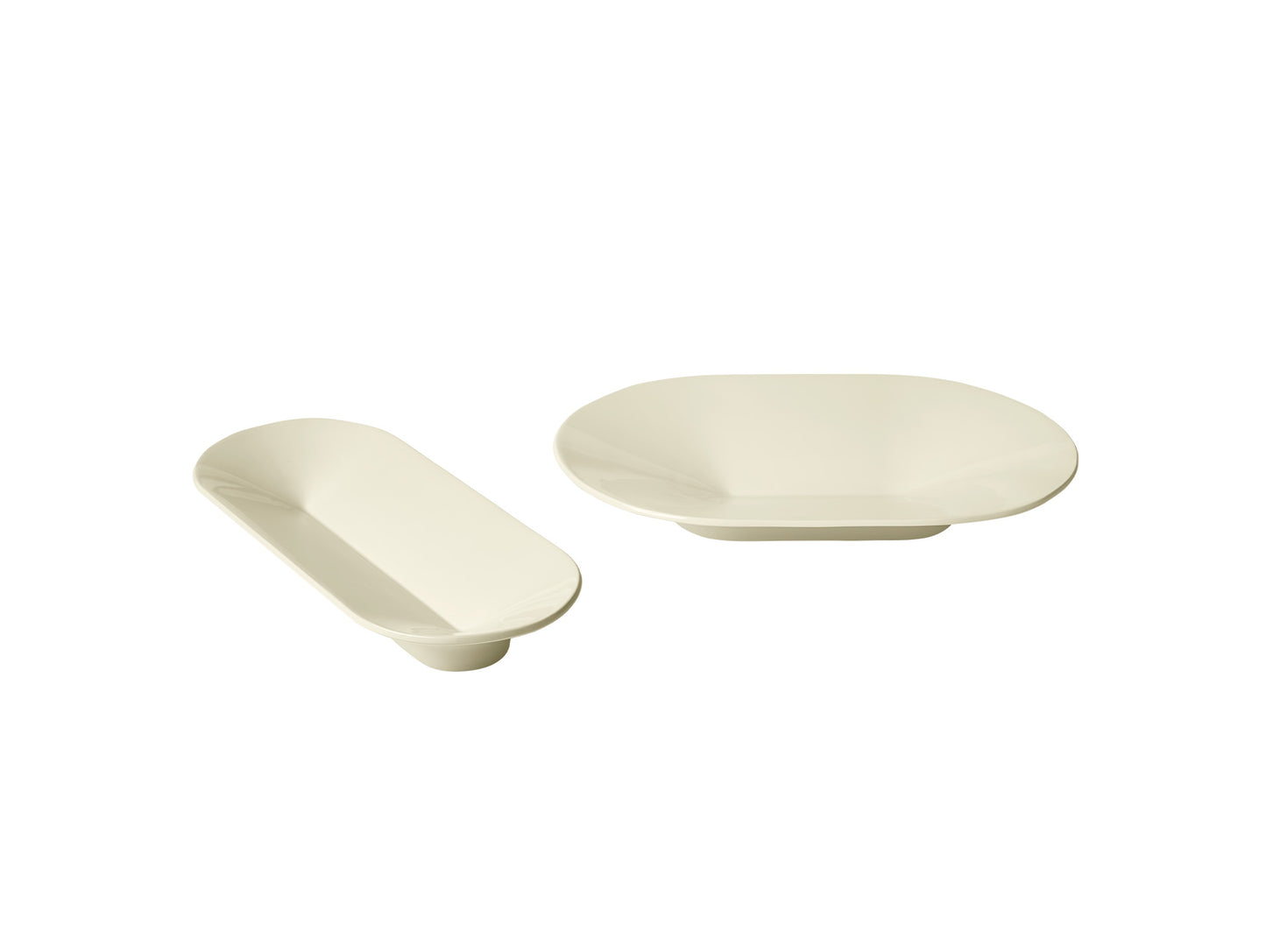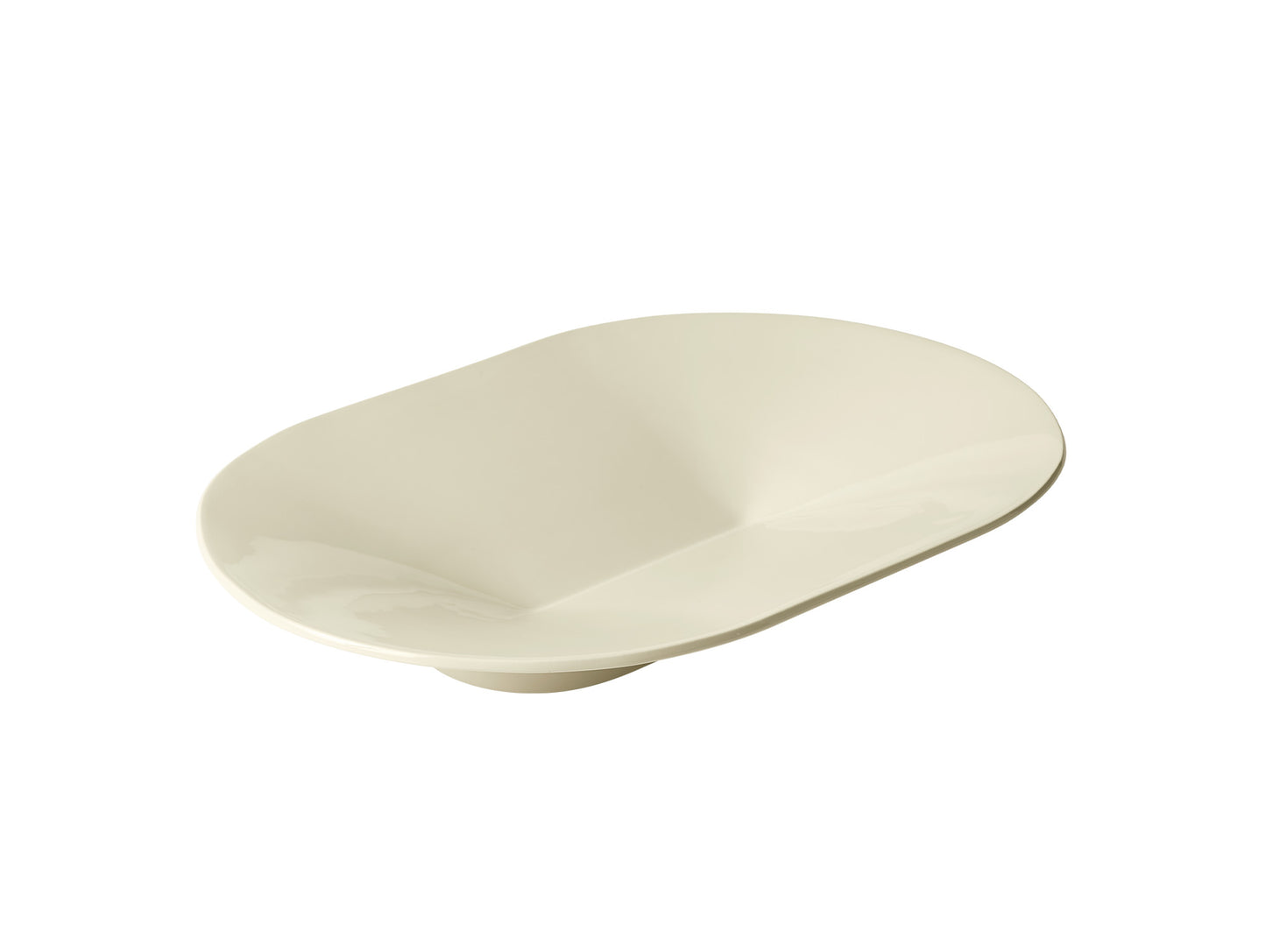 Studio Kaksikko のデザインについて: 「Mere Bowl は、サラが私たちのスタジオでろくろで作った小さな磁器作品からインスピレーションを受けました。その円錐形の丸い形とその底の厳格なラインとのコントラストが、私たちに実験を続けるインスピレーションを与えました。最初はプロトタイピングを行っていました」 「私たちは紙を使って、折り曲げることによってボウルのような表面を作り、その後、曲げられる素材から石膏の剛性に移行しました。私たちは、それが質素で実用的なアイテムであると同時に、空のときに美しい影を落とすエレガントで独立した彫刻の形であることを望んでいました。」