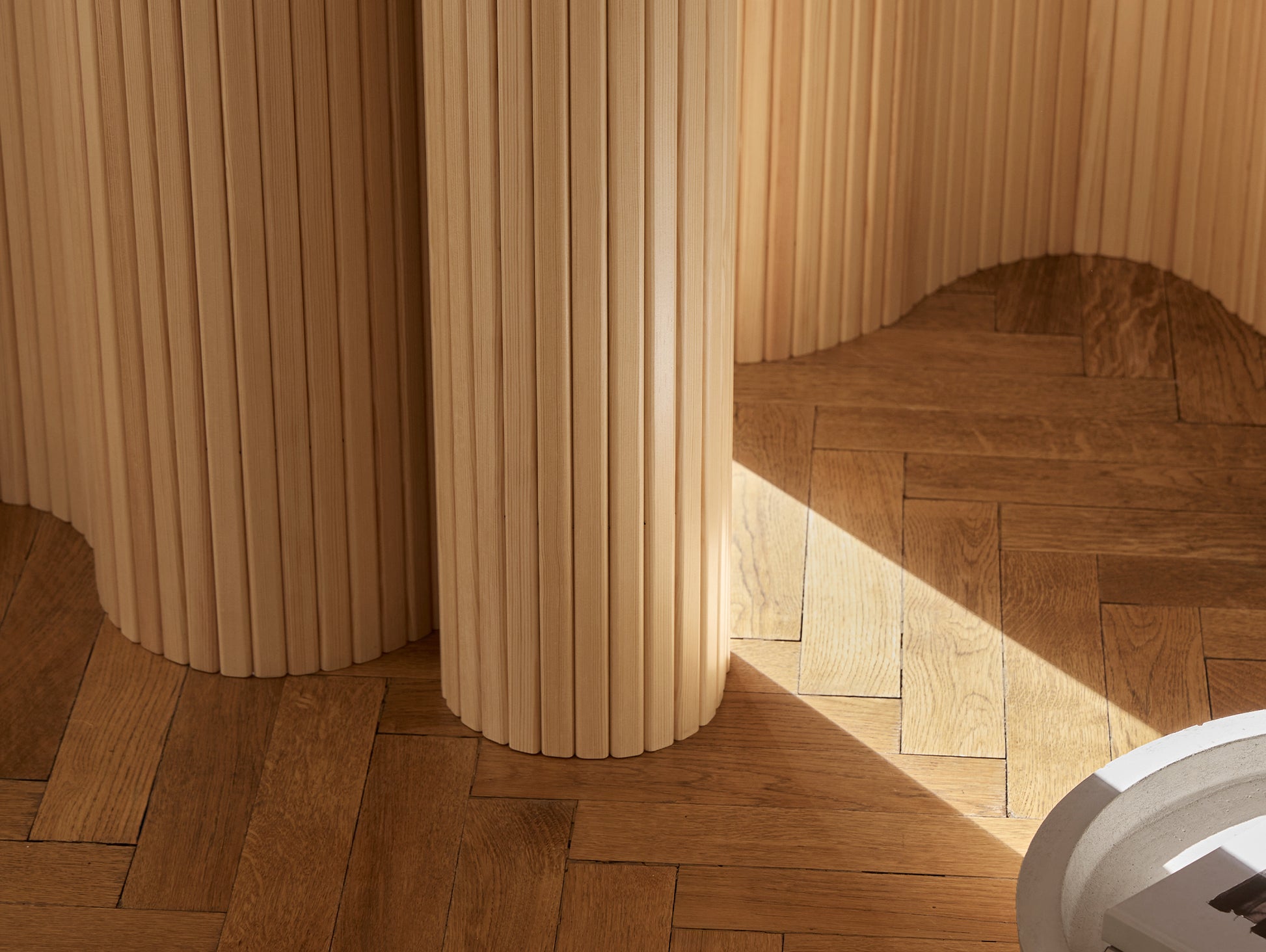 Screen 100 は、フィンランドの有名な建築家兼デザイナーであるAlvar Aaltoによって作られた、驚くほど多用途なモジュール式ルームディバイダーです。高品質のパインウッド無垢材の細片を垂直方向に正確に並べて巧みに作られたスクリーン 100 は、保管に便利なように簡単に巻き上げたり、広げて直線や緩やかな曲線を描くことができます。部屋を区切ったり、スペースを区切ったりするために設計されたこのそびえ立つディバイダーは、高さ 150 cm という印象的な高さで、景色を妨げることなくどんな部屋にも構造を加えます。