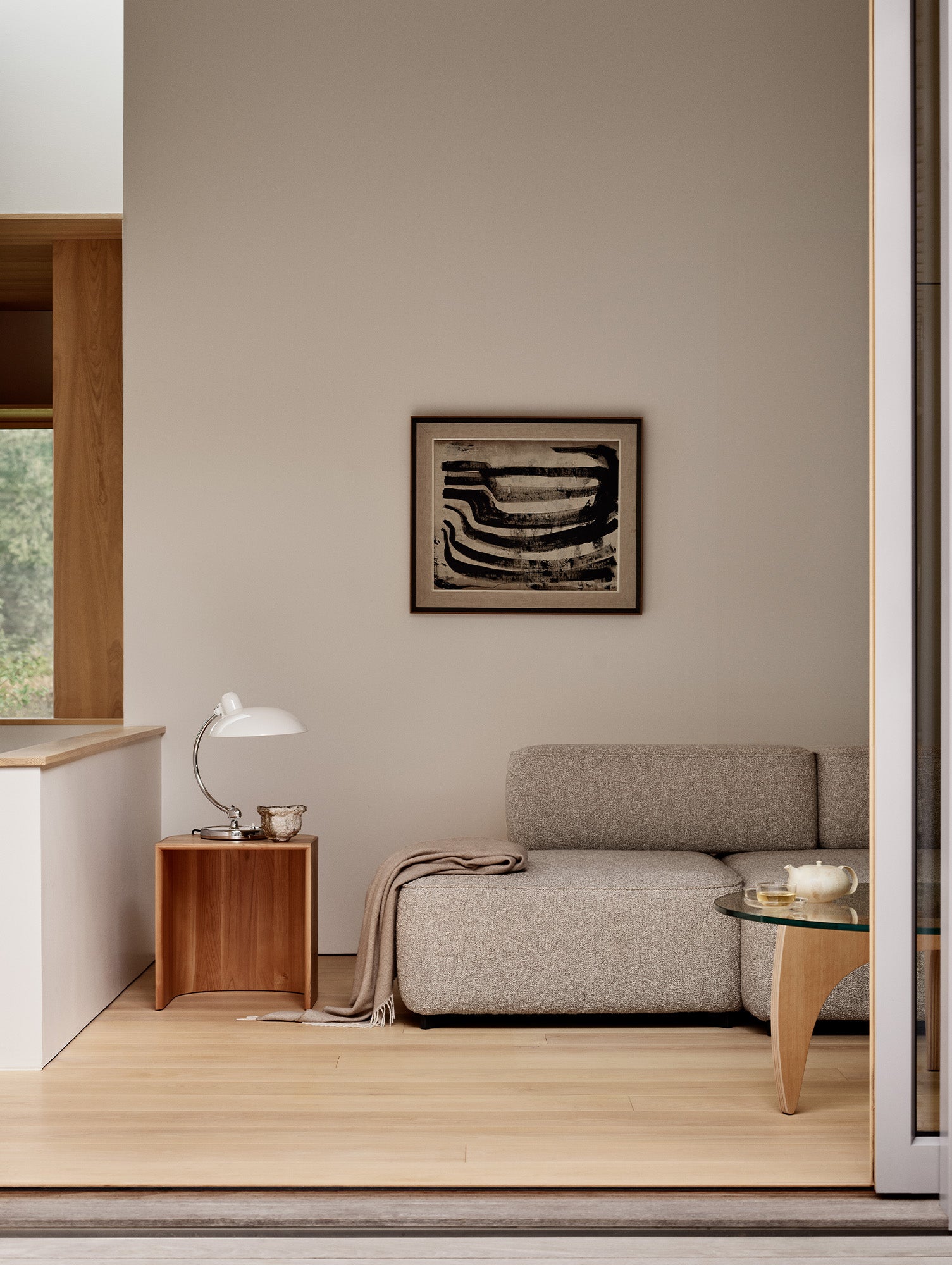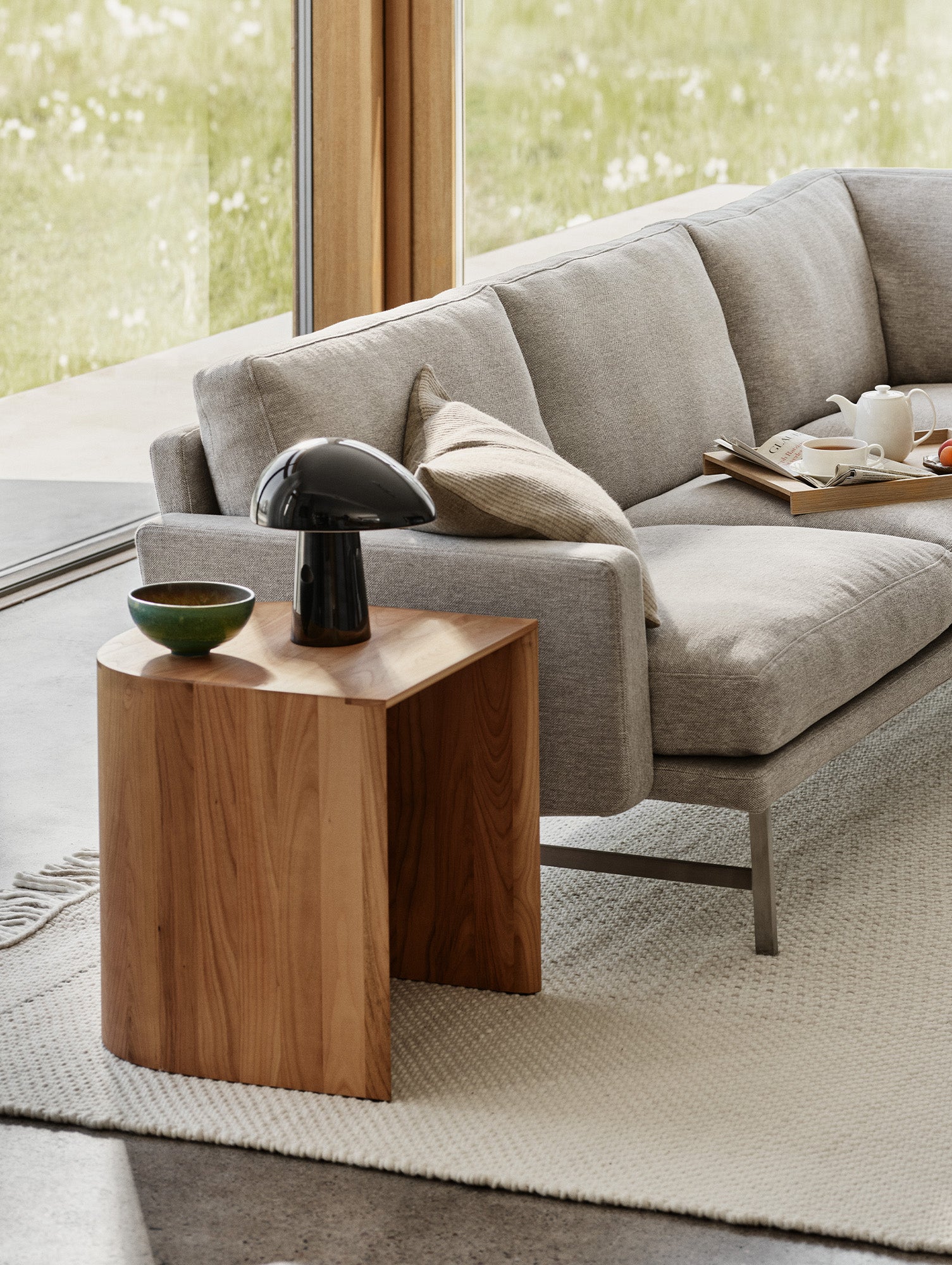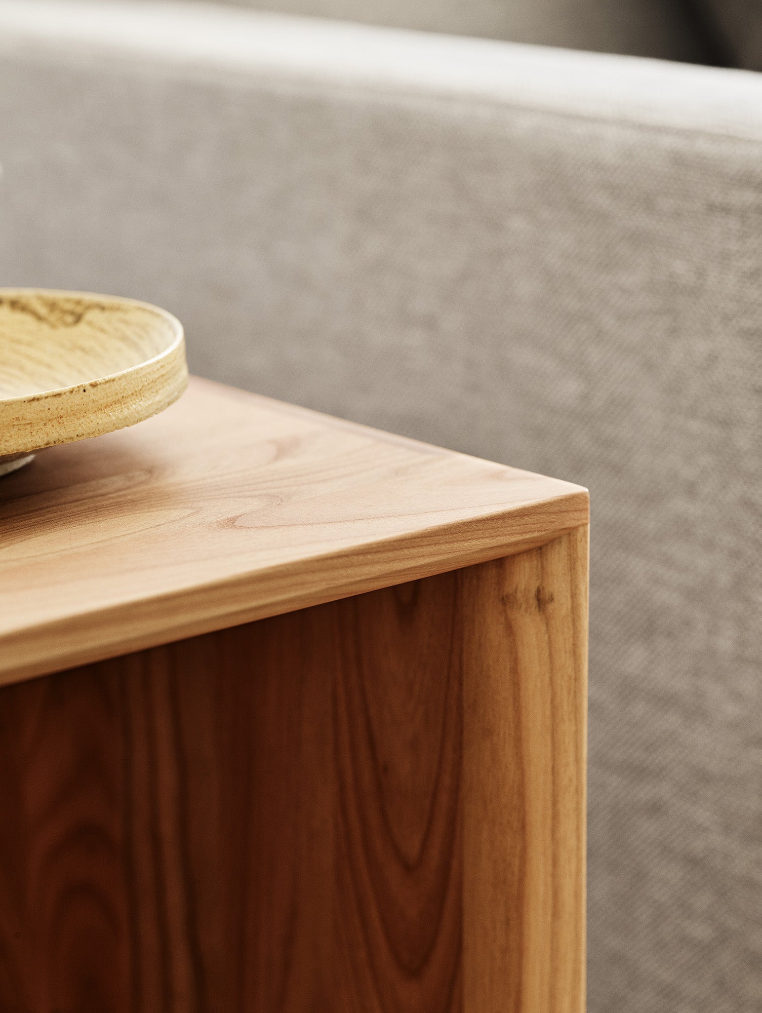 With its minimal and clean form, the table features an open underside that allows for easy storage of everyday items and can also serve to conceal sockets or clutter when positioned against a wall. The natural wood grain and soft curves of the top bring a sense of warmth and elegance to the piece.