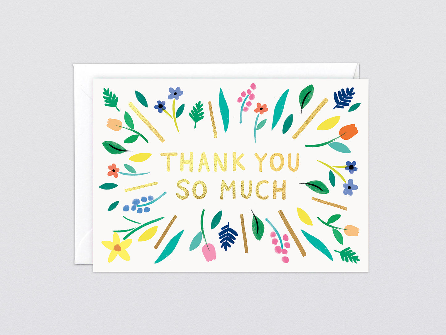 このカラフルなカードはシャーロット・トランスがイラストを描いたもので、生花が咲き誇り、「ありがとうございます」という文字が金箔押しの文字で印刷されています。