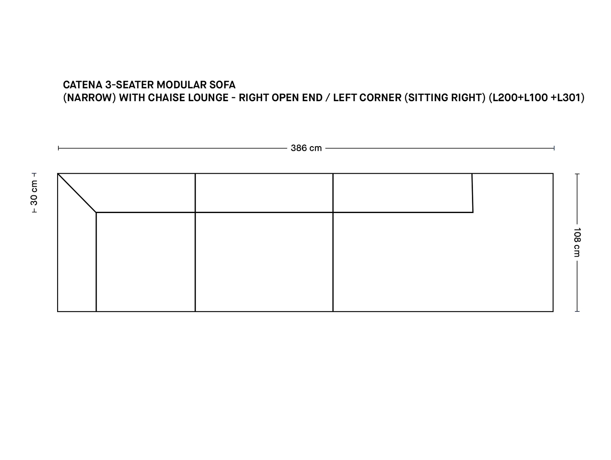 3-Seater (Narrow) with Chaise Lounge (Available with right corner or left corner) - Width: 386 cm, Height: 76 cm, Seat Height: 42 cm, Depth: 108 cm, Seat Depth: 78 cm