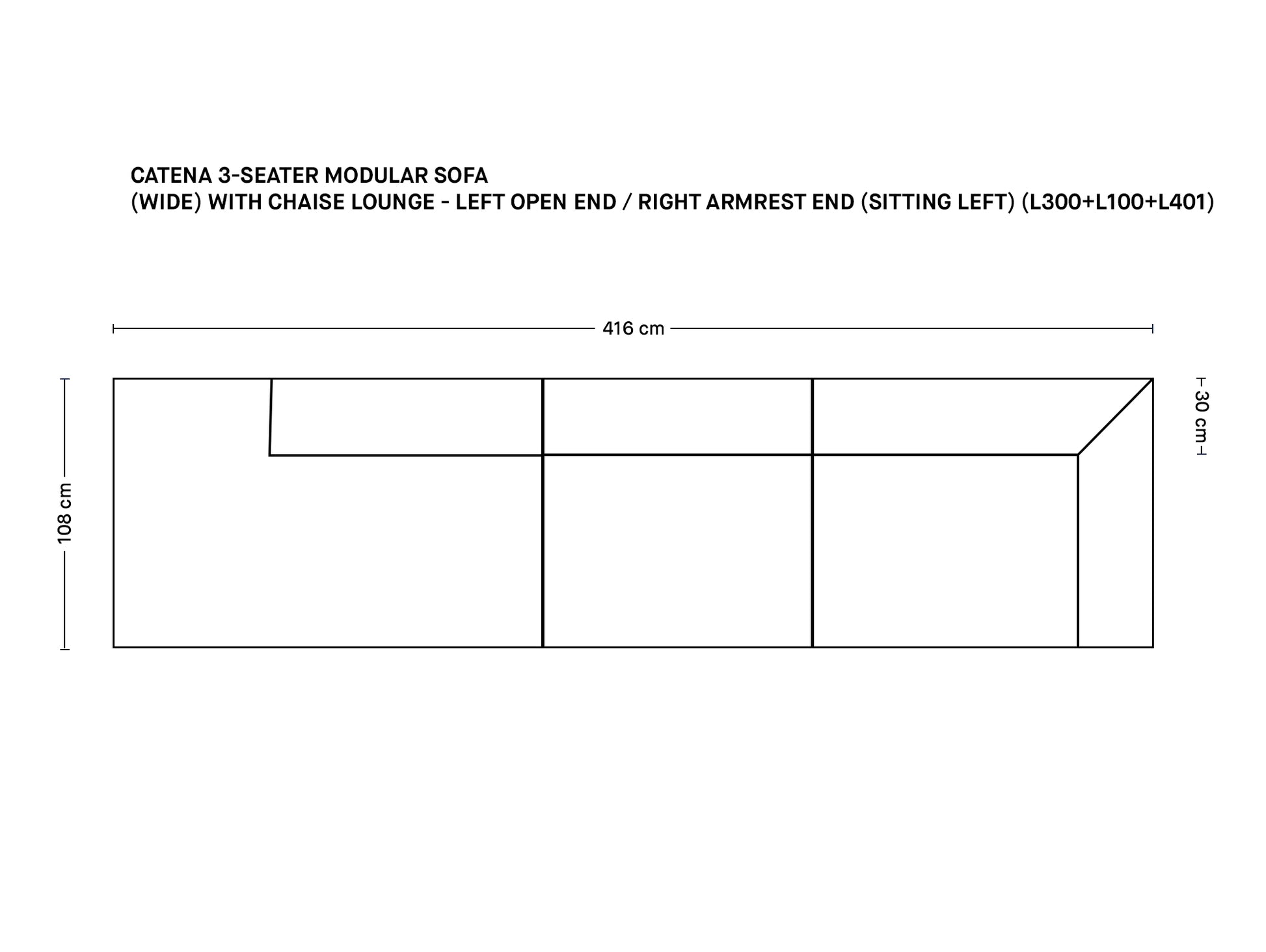 3-Seater (Wide) with Chaise Lounge (Available with right armrest end or left armrest end) - Width: 416 cm, Height: 76 cm, Seat Height: 42 cm, Depth: 108 cm, Seat Depth: 78 cm