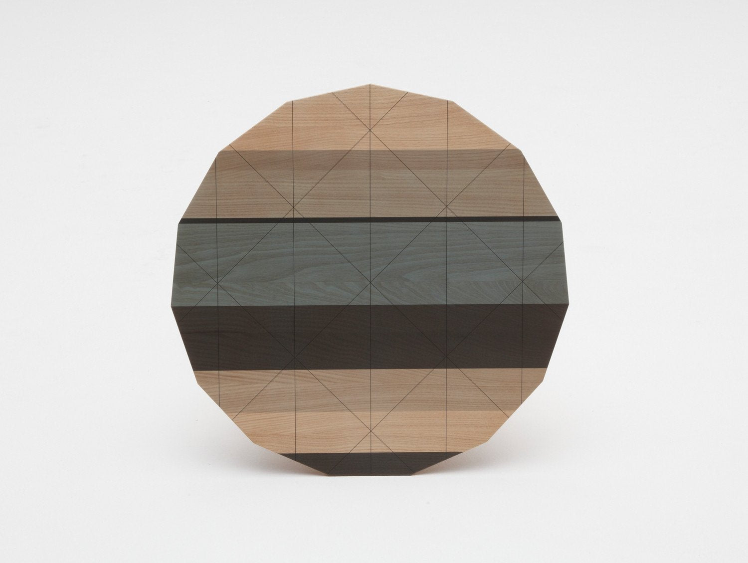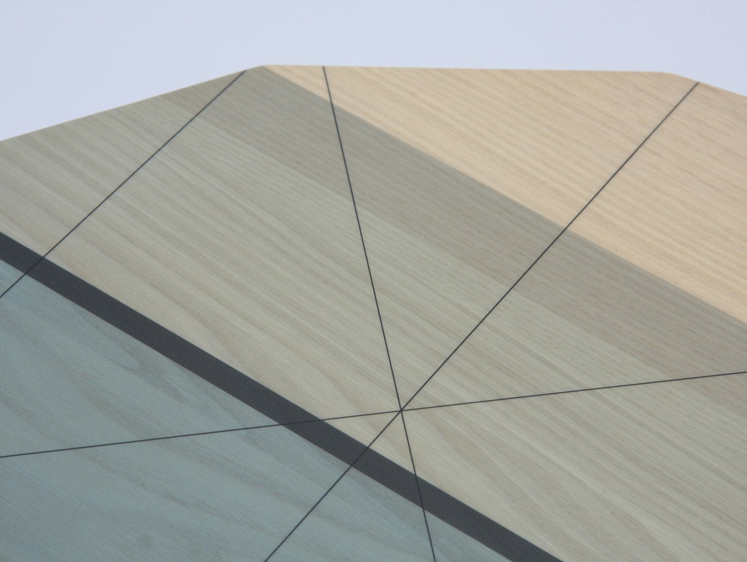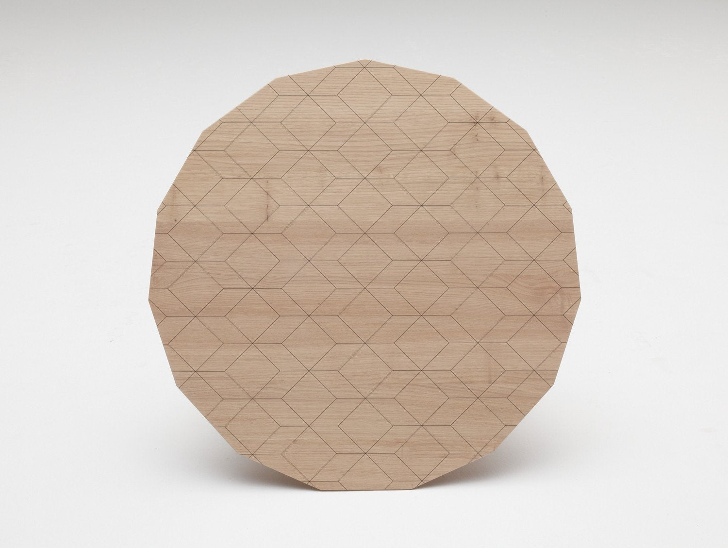 This faceted table with a barrel-like base explores woodworking techniques and the characteristics of joined timber slats. Transparent colours and graphic patterns by European graphic masters, Scholten and Baijings, superimpose contemporary design onto traditional timber production. This series of side tables comes in four types and three different sizes; each with their own combination of colours, height and diameter.