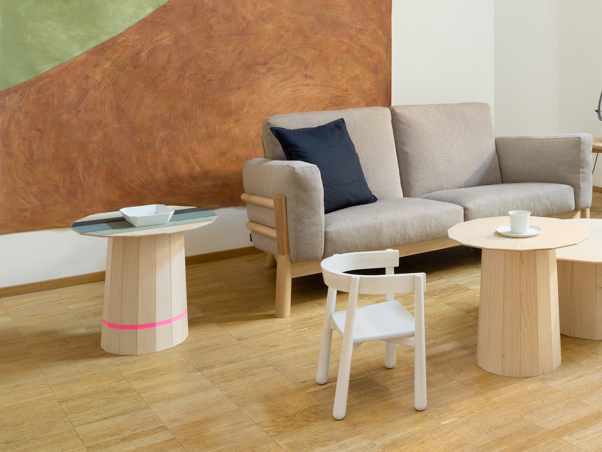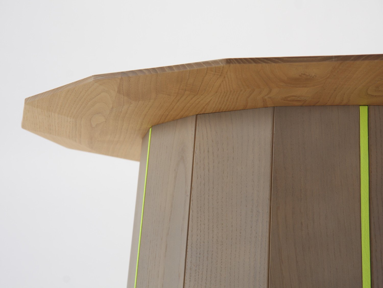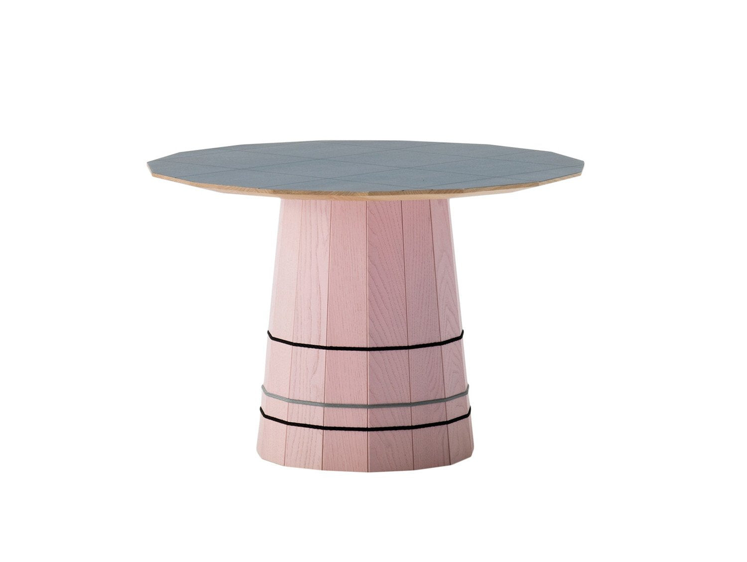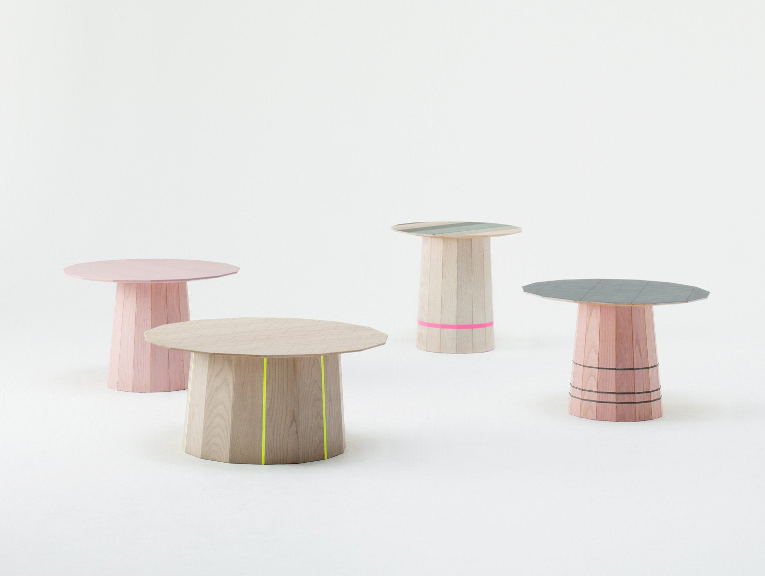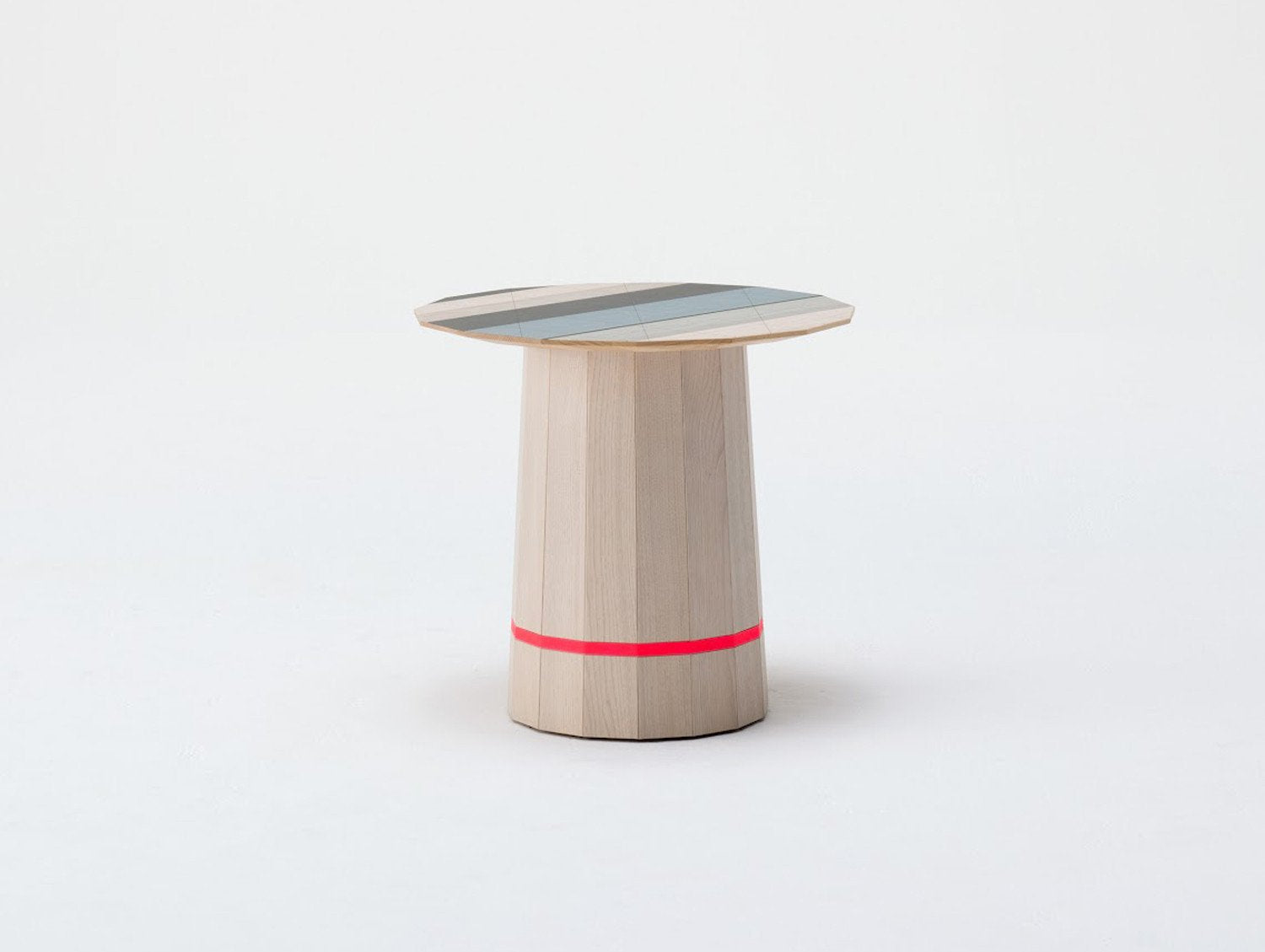 Inspired by the traditional Japanese wood joint technique yatoi-sanetsugi, the base of this table is made of individual laths that are connected at intricate angles to form a round tapered base. Except for the all-pink table, the tables in this series come with coloured textile inlays that accentuate the barrel-like base. Like all Karimoku New Standard items, Colour Wood is finished to the highest standards. Even the underside of the tabletop has not been overlooked.