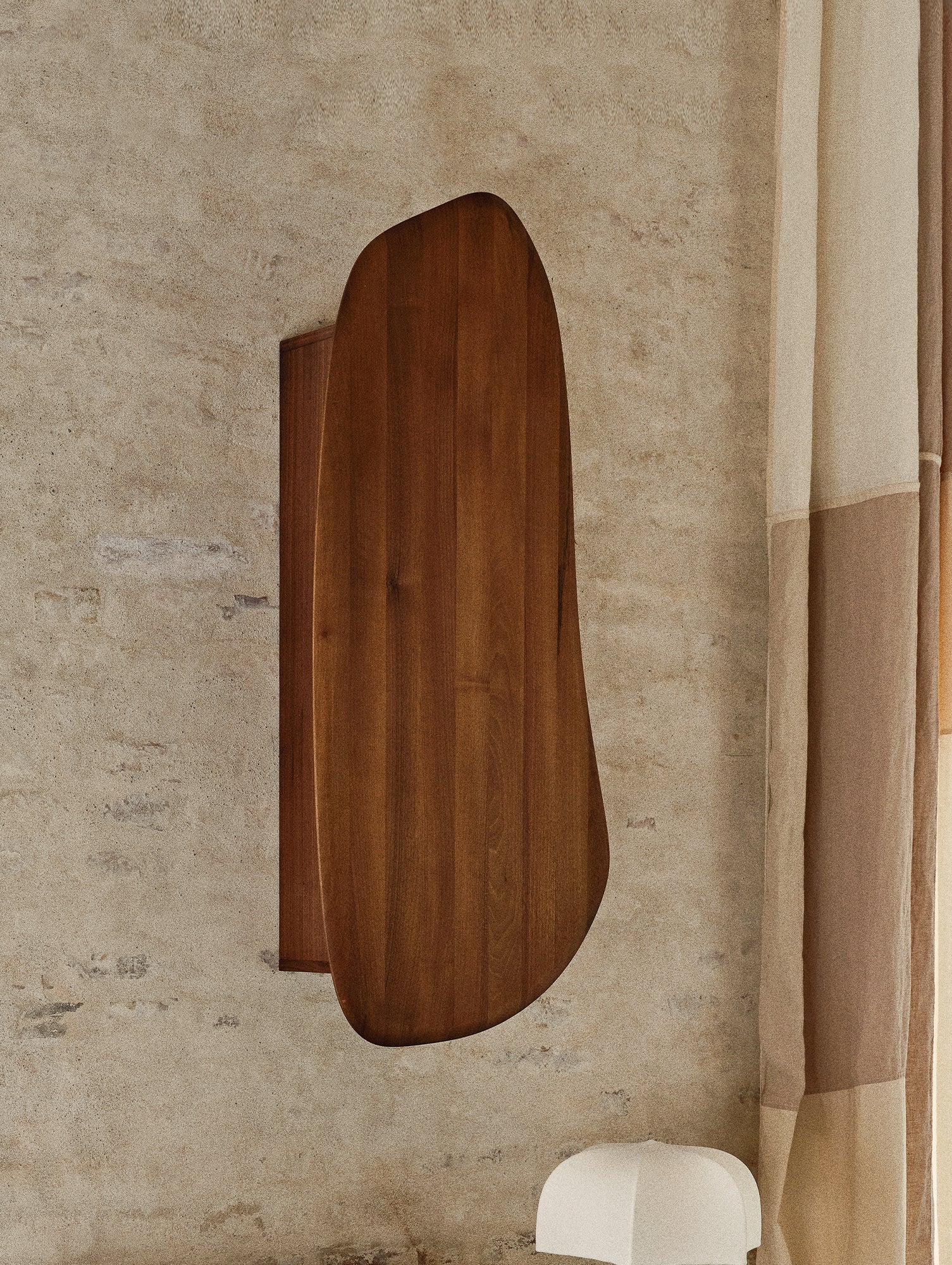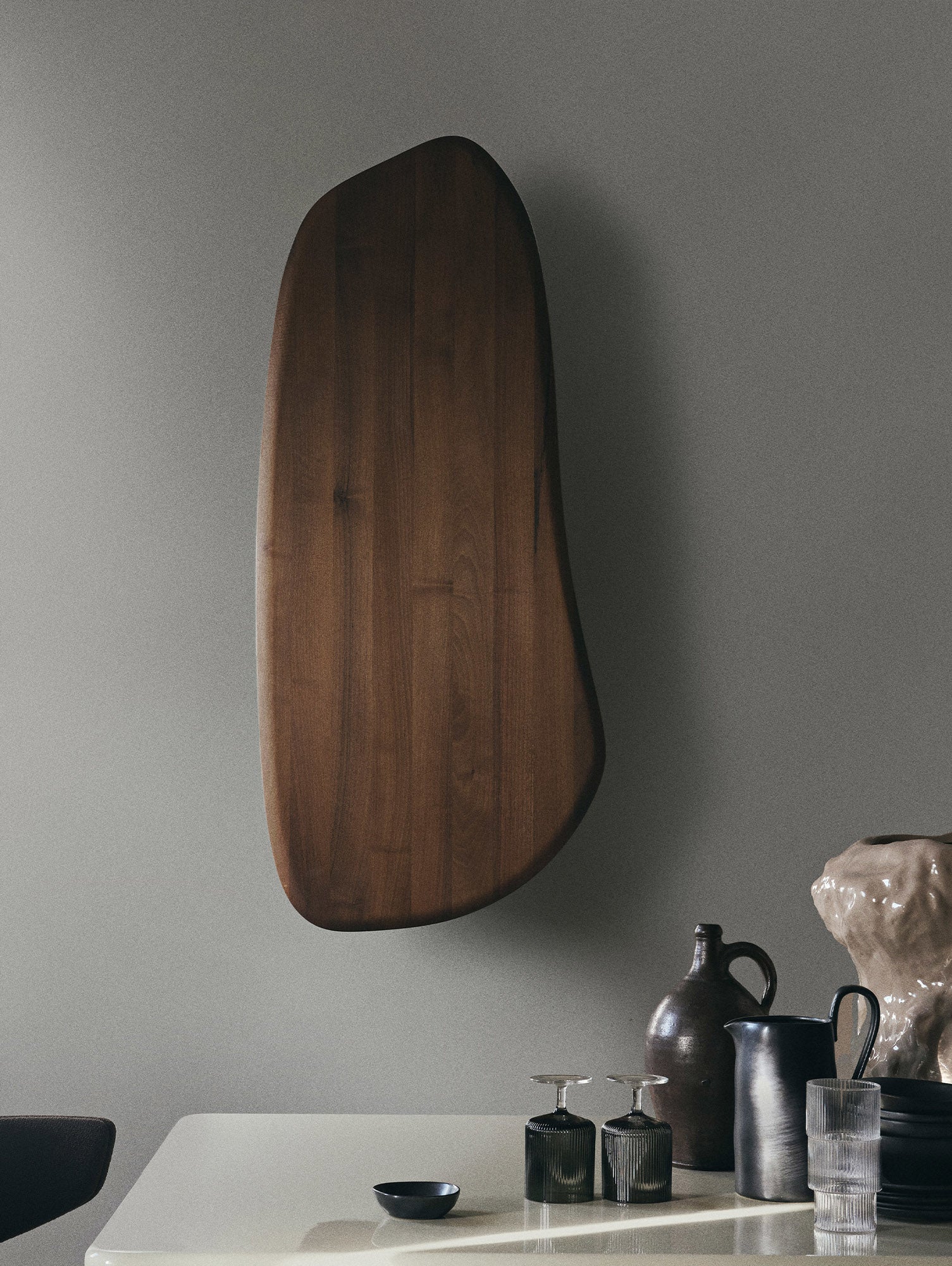 Designed by Ferm Living, the Feve Wall Cabinet has an elegant, organic aesthetic. The name is inspired by the French word 'Fève,' meaning 'bean,' which alludes to its distinctive shape. Crafted from FSC-certified solid European oiled walnut and walnut veneer with an MDF core, this slim cabinet features four internal shelves. The cabinet door can be mounted to open either to the right or left.