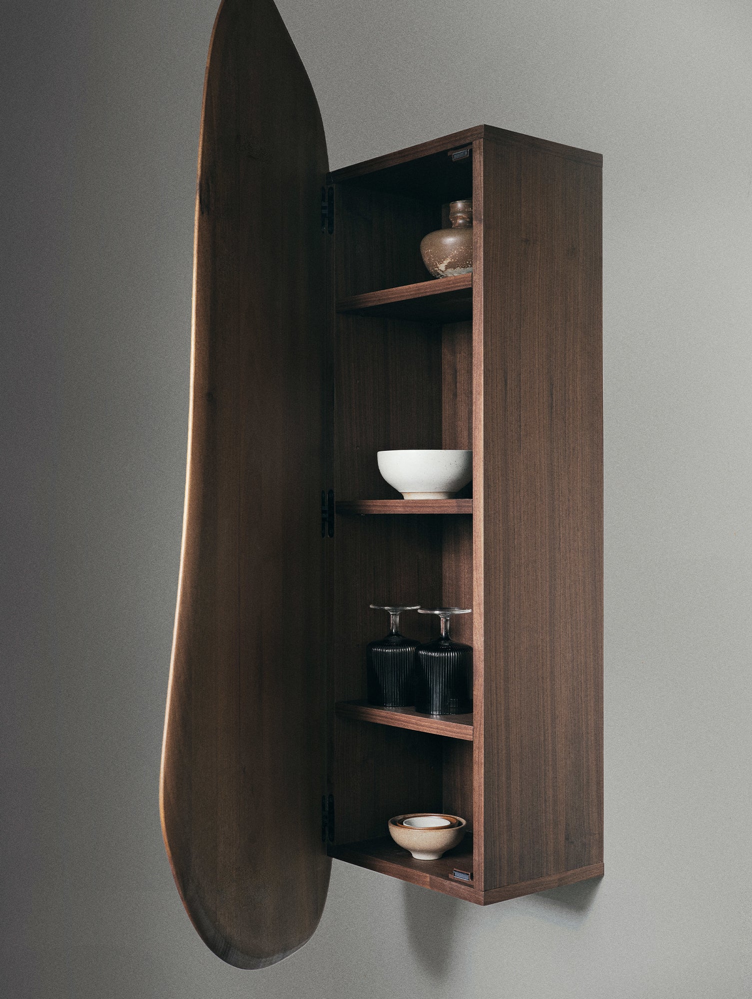 The inner shelves are both removable and modular, allowing users to adjust their height as needed. This unique and practical design not only creates a statement in any space but also gives the cabinet a floating appearance when mounted on the wall. The cabinet is an ideal storage solution, suitable for storing anything; from jewellery in the bedroom to glasses or small bowls in the dining room.