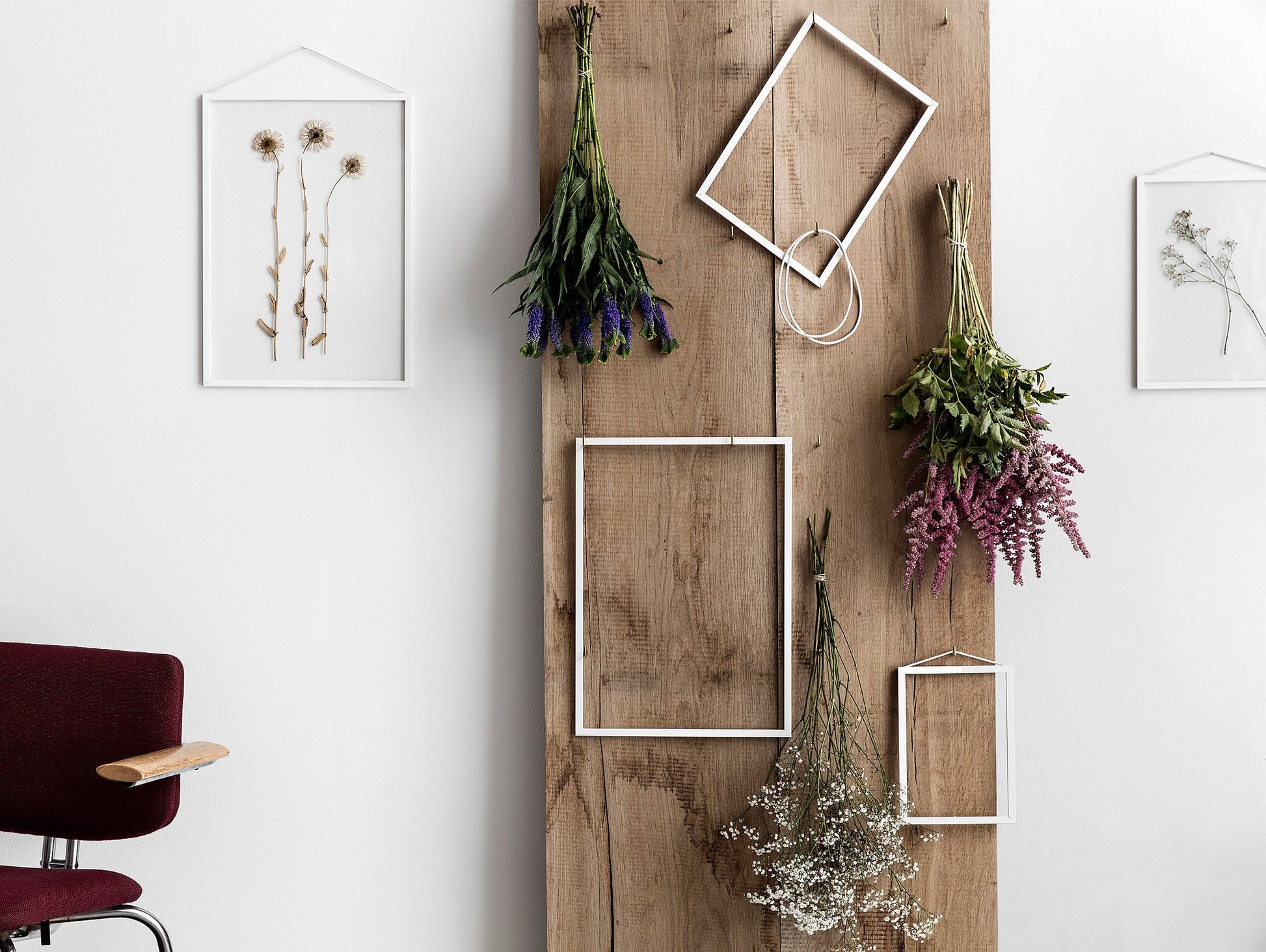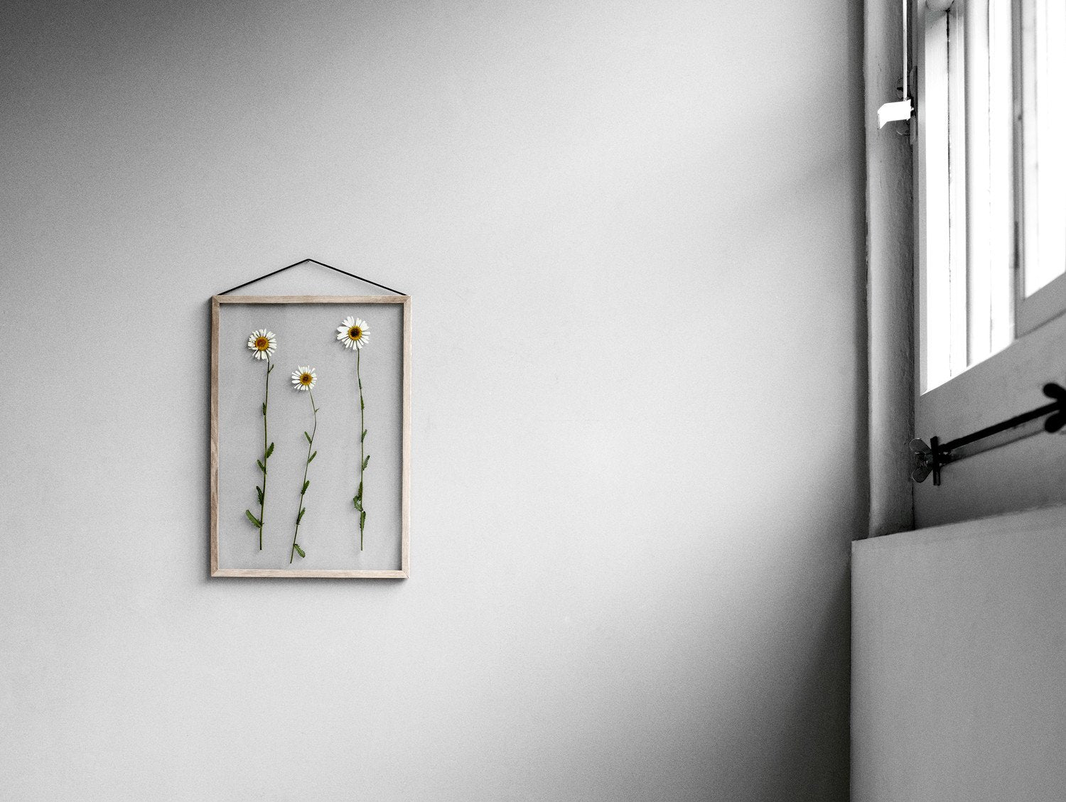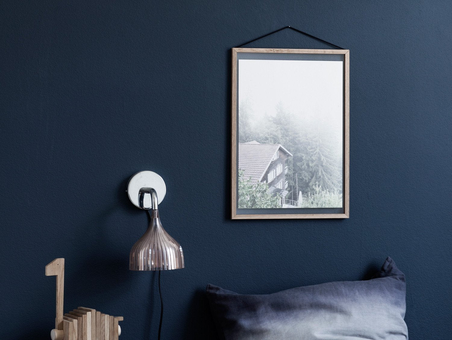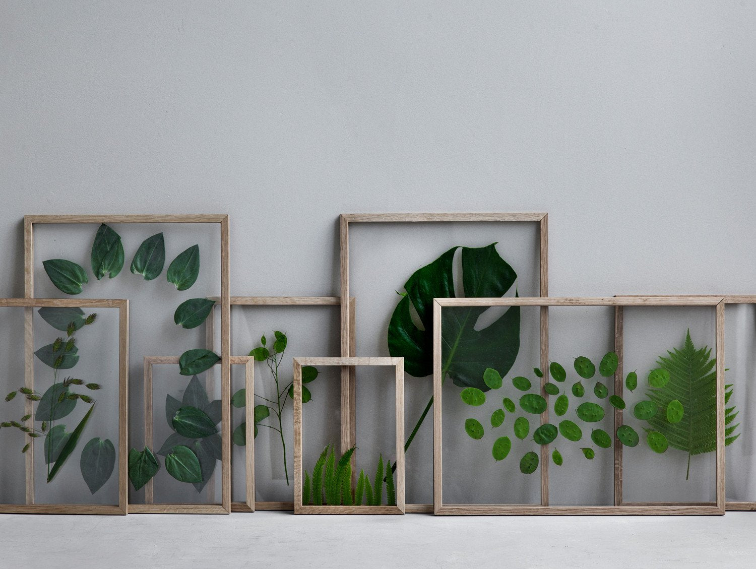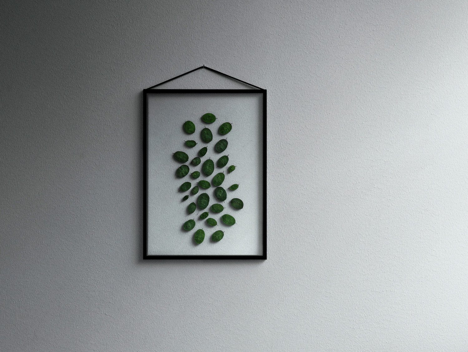 Frame consists of two pieces of acrylic glass, four pieces of solid oak timber or painted aluminium and a silicone rubber band. The rubber band both holds the frame together and also serves for hanging the frame on your wall if desired. Available in four sizes: A5, A4, A3 and A2.