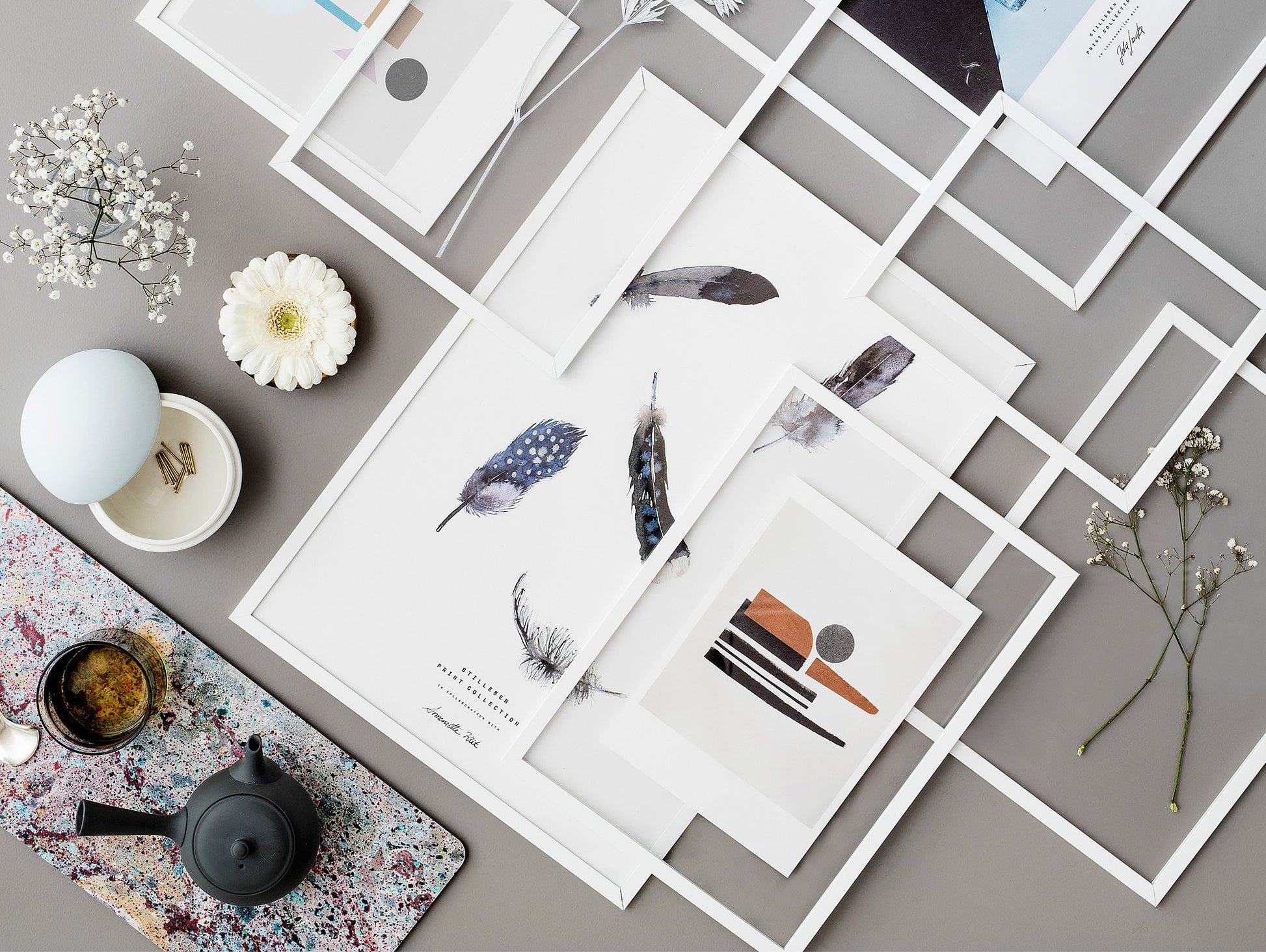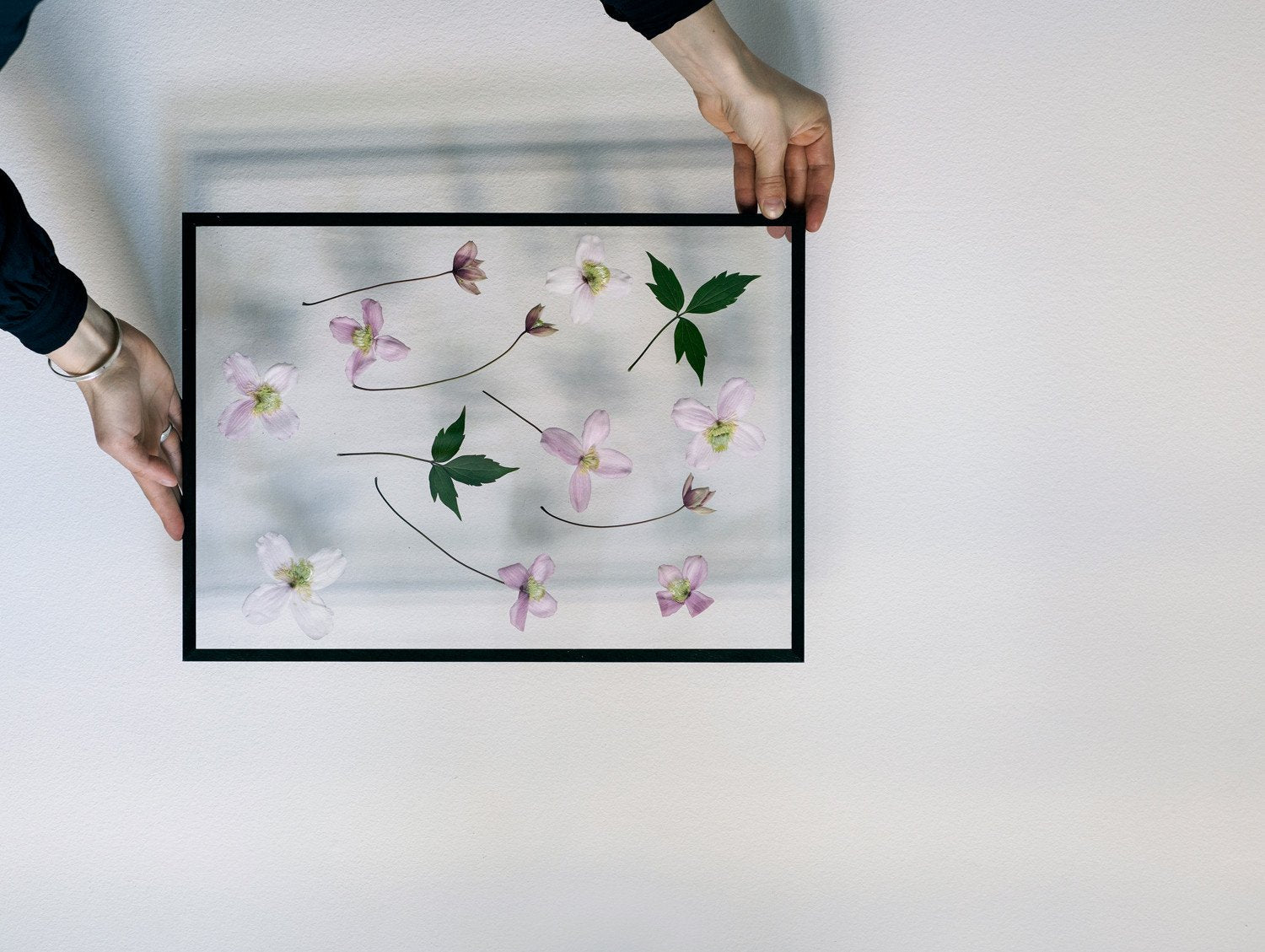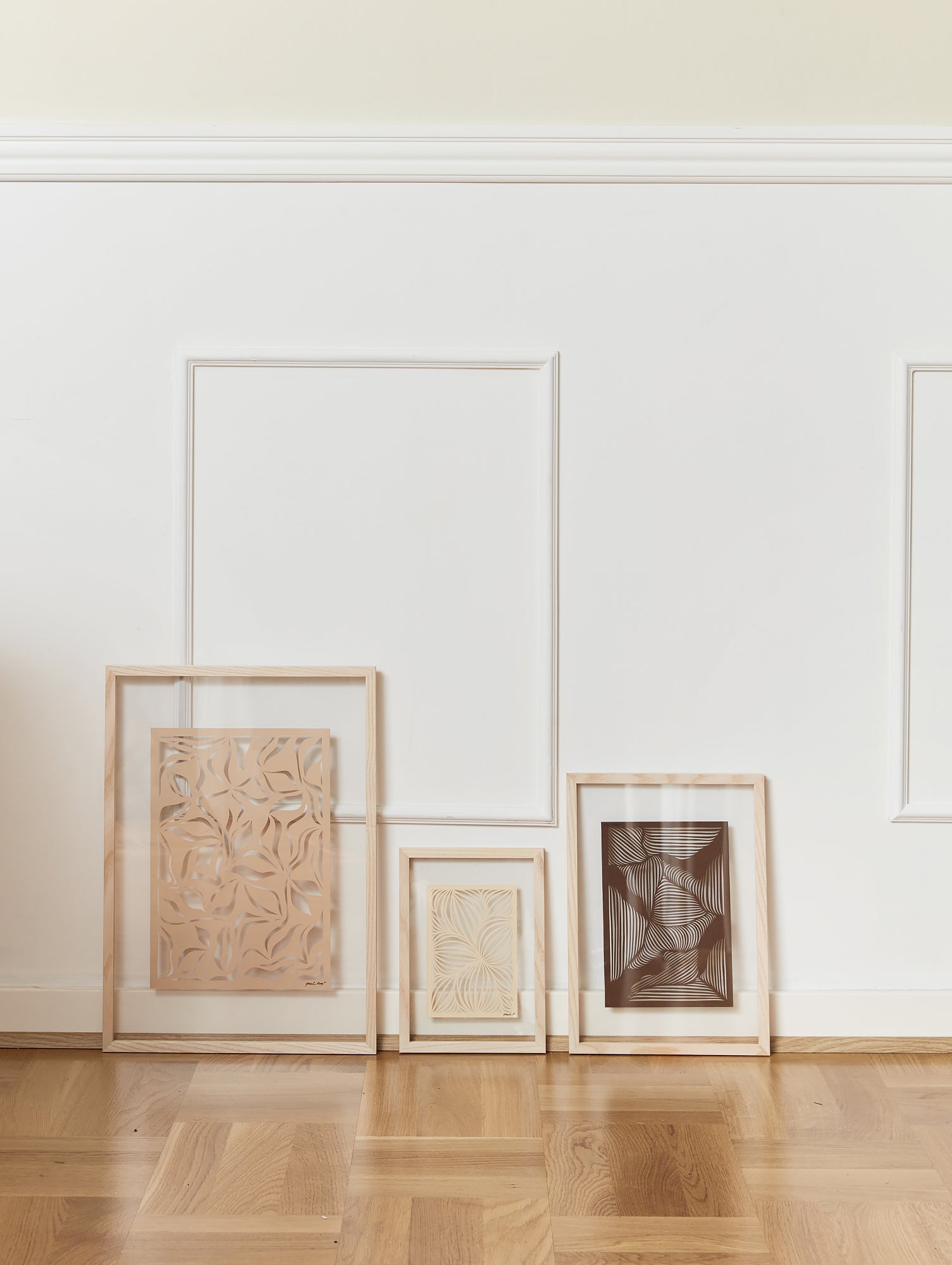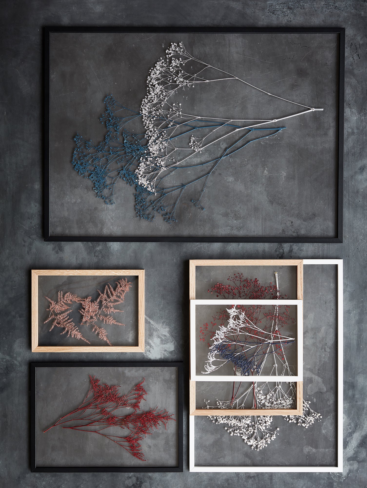 Frame consists of two pieces of acrylic glass, four pieces of solid oak timber or painted aluminium and a silicone rubber band. The rubber band both holds the frame together and also serves for hanging the frame on your wall if desired. Available in four sizes: A5, A4, A3 and A2.