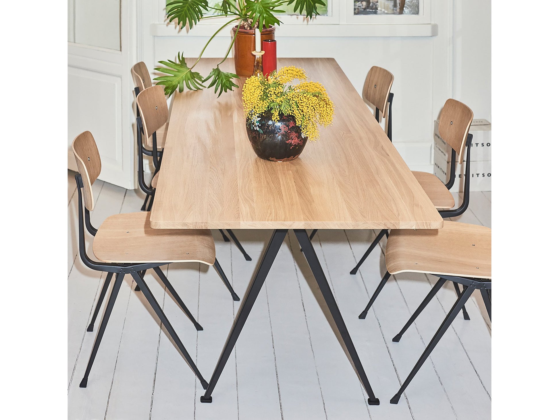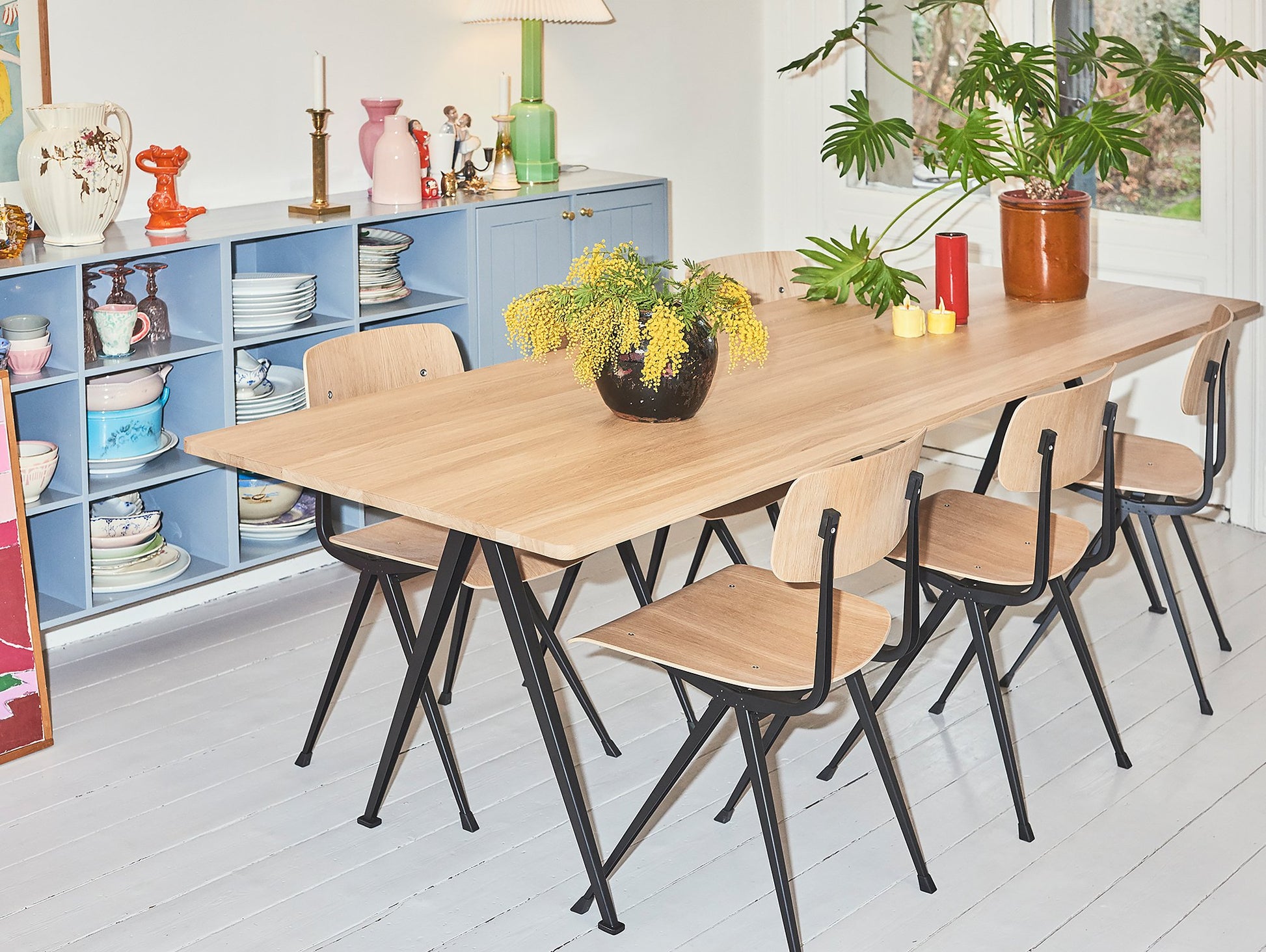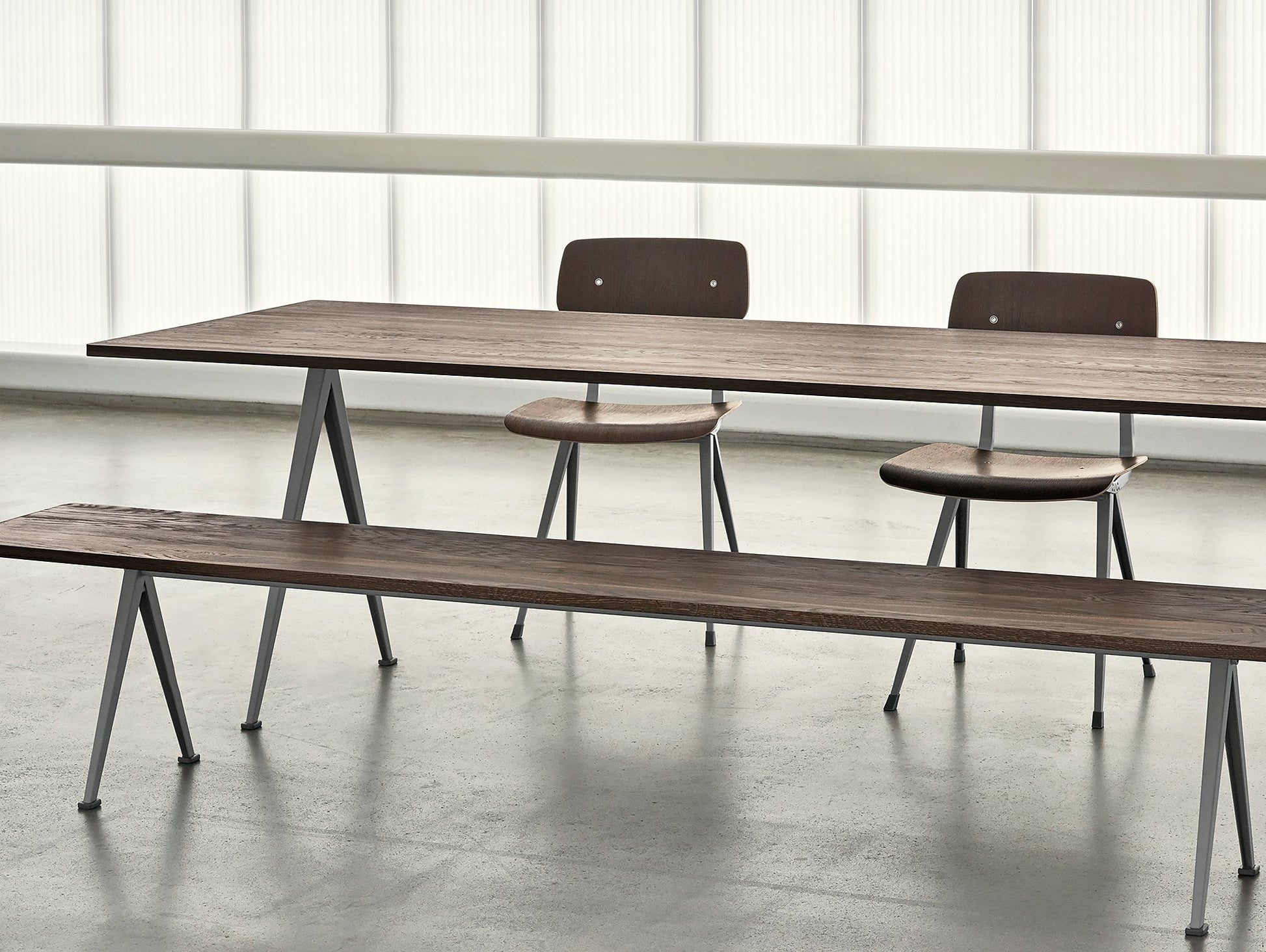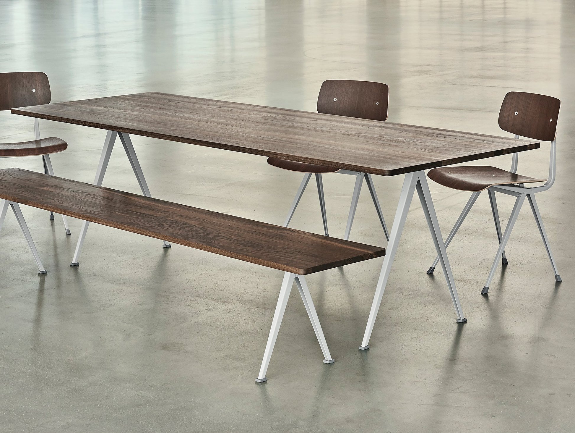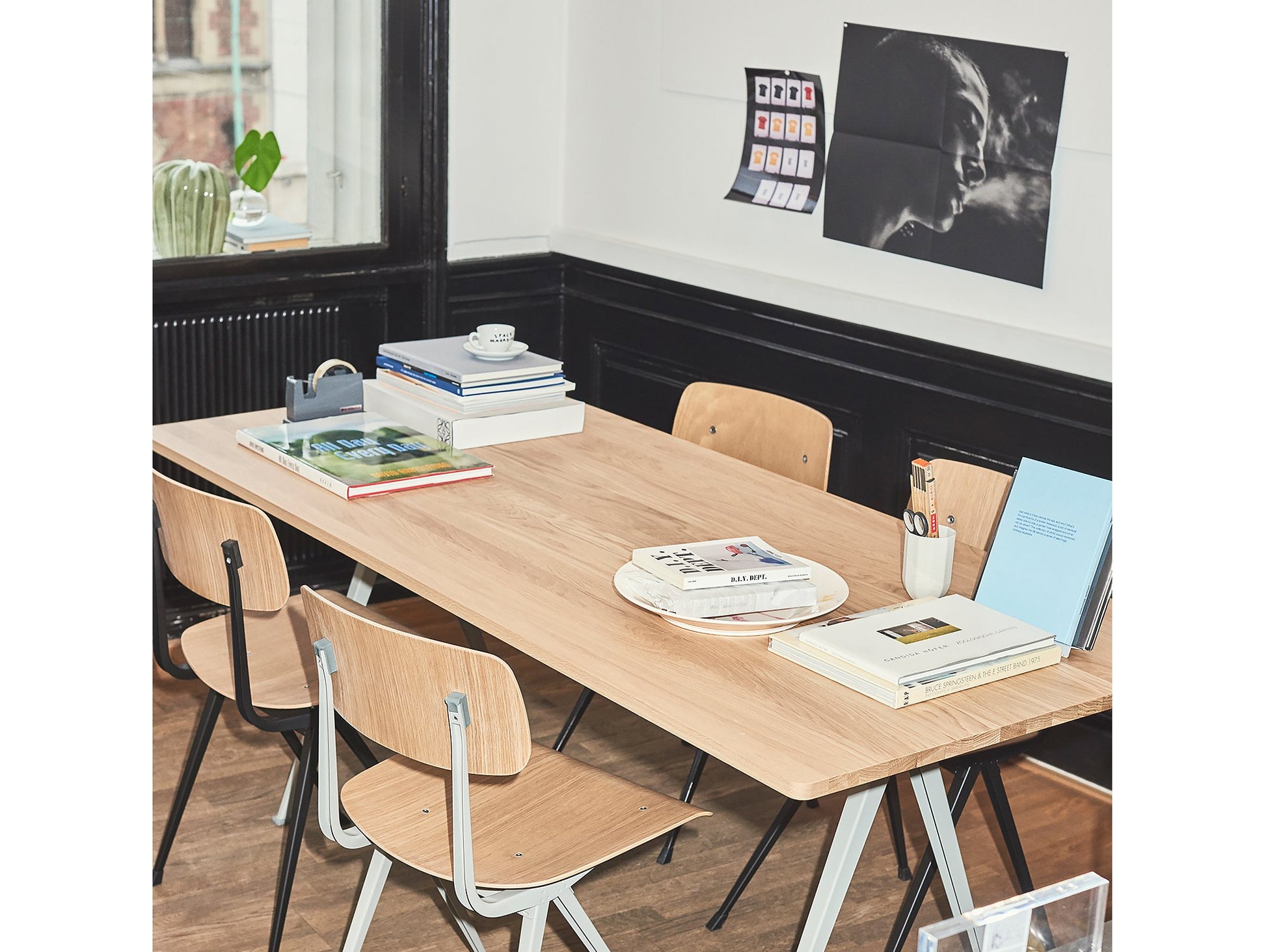 Created to be adaptable, light and strong, the Result Chair and Pyramid Tables are the last word in cutout sheet steel construction. Originally created by Friso Kramer and Wim Rietveld while working at Ahrend in the 1950s, the collection has been relaunched by HAY together with Ahrend.