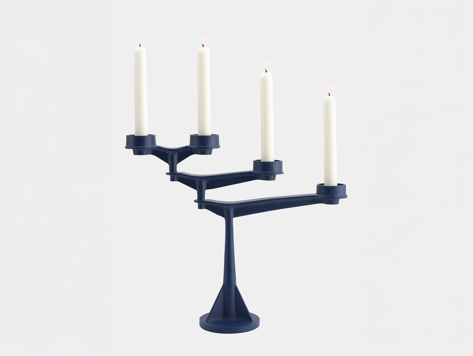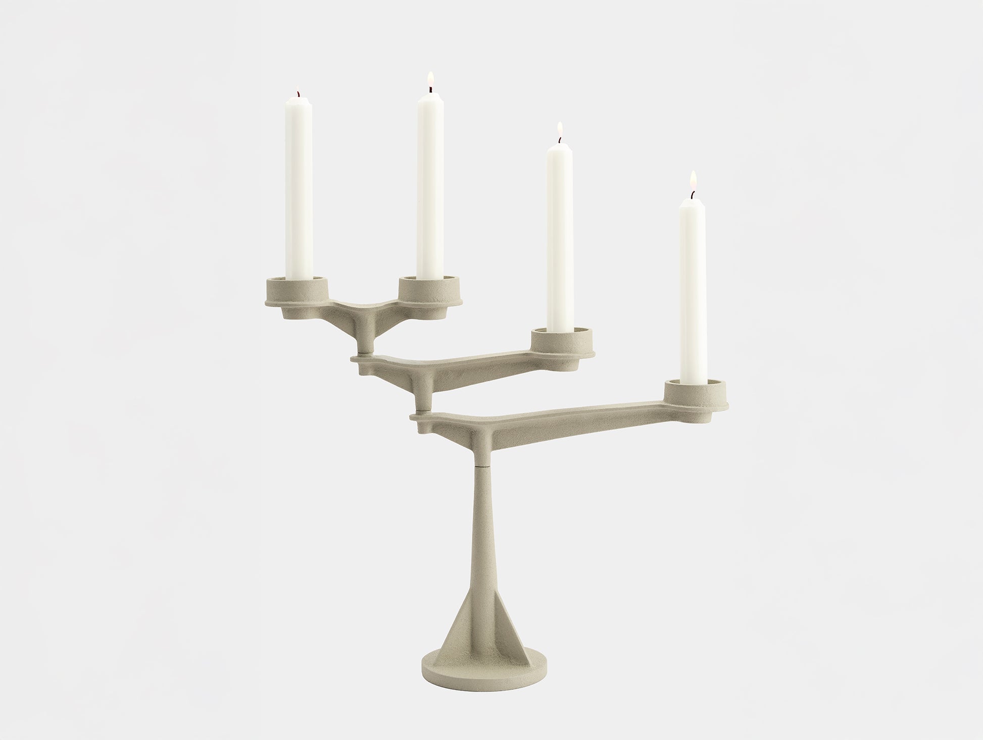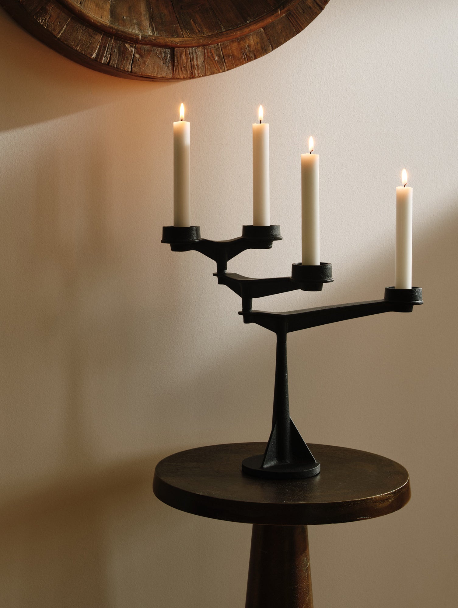 Made from matt powder-coated iron, it is designed as a kinetic table-top centrepiece, allowing endless configurations as the arms rotate to create different arrangements of candles. The robust construction ensures lasting use both as a sculptural object and functional candelabra, built to be enjoyed for years.
