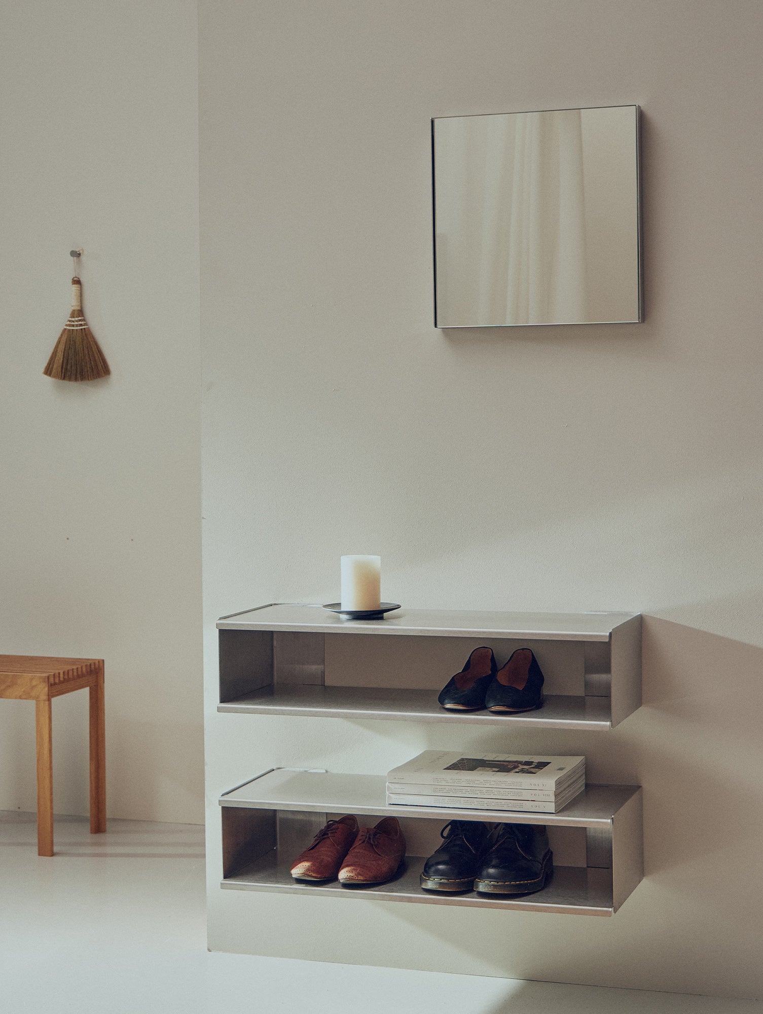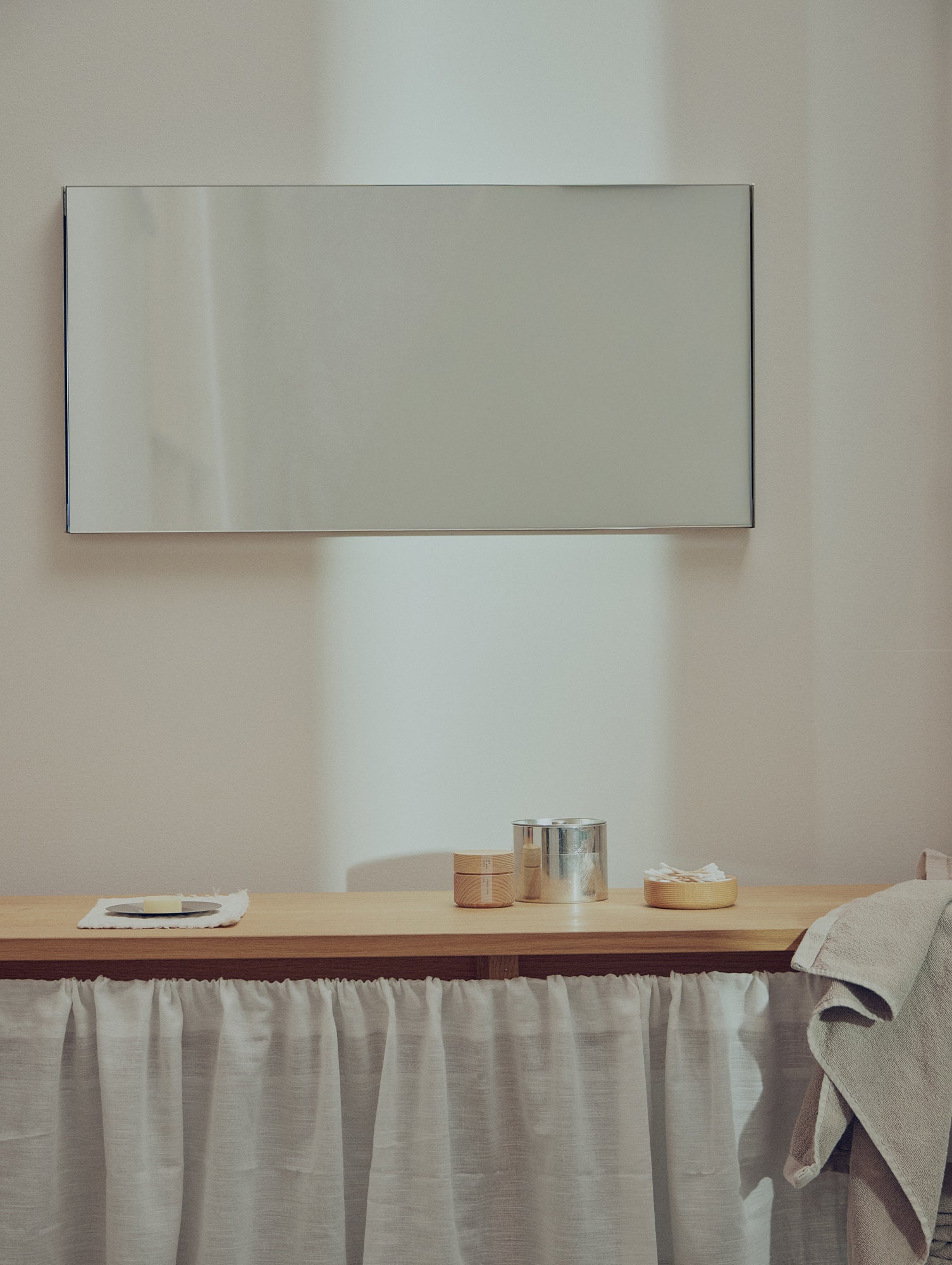 Designed by Herman Studio, the Taper Mirror is a minimalist wall mirror framed in brushed stainless steel. The slim profile and softly folded edges highlight the precision of the construction, while the brushed finish gives the steel a calm, tactile appearance. Subtle fixings allow the mirror to sit neatly against the wall, creating a clean look. The mirror can be mounted horizontally or vertically to suit different spaces and layouts.