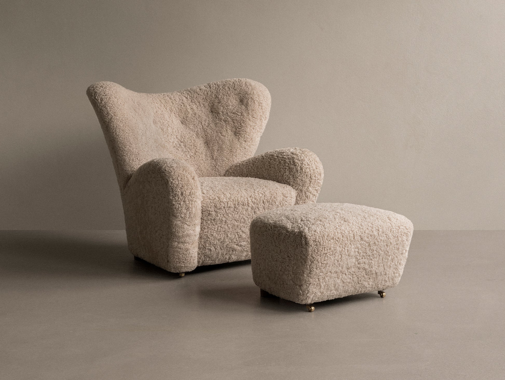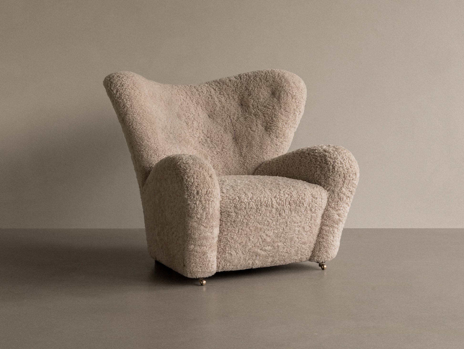 The Tired Man Lounge Chair features a distinctive shape with a high backrest and deep seat, providing excellent support and comfort. The chair is upholstered with high-quality sheepskin and is known for its plush cushions and luxurious feel. Crafted with a combination of oak, plywood frame, pocket springs and multiple layers of foam and wadding, this chair is not only durable but also timeless in its design. The base is a combination of thick wooden feet at the back and solid brass castors at the front: It makes moving the furniture effortless. The chair's soft sheepskin upholstery ensures ultimate comfort, while its distinctive and captivating design makes it the centrepiece of any space.
